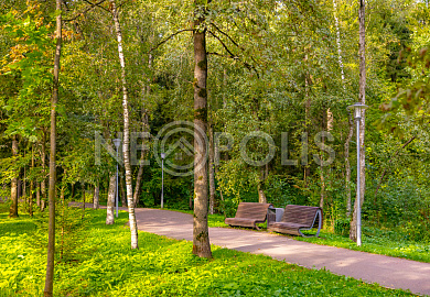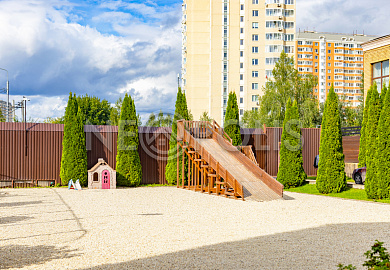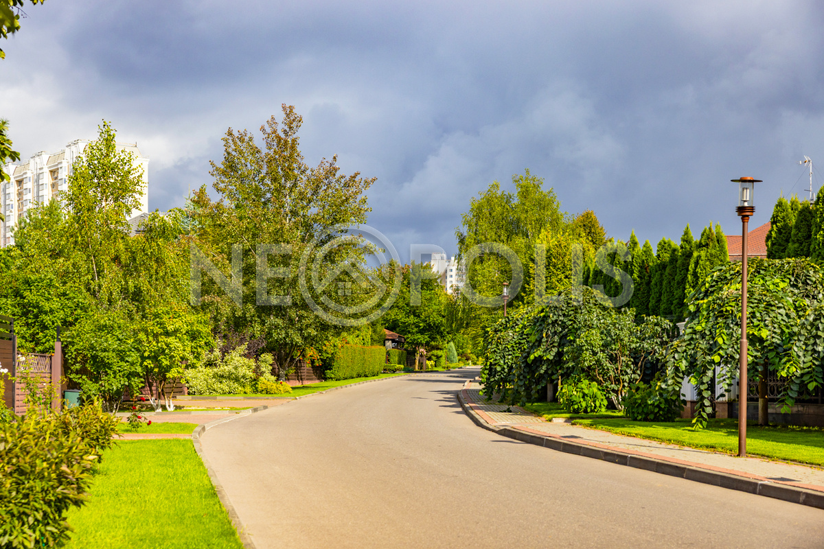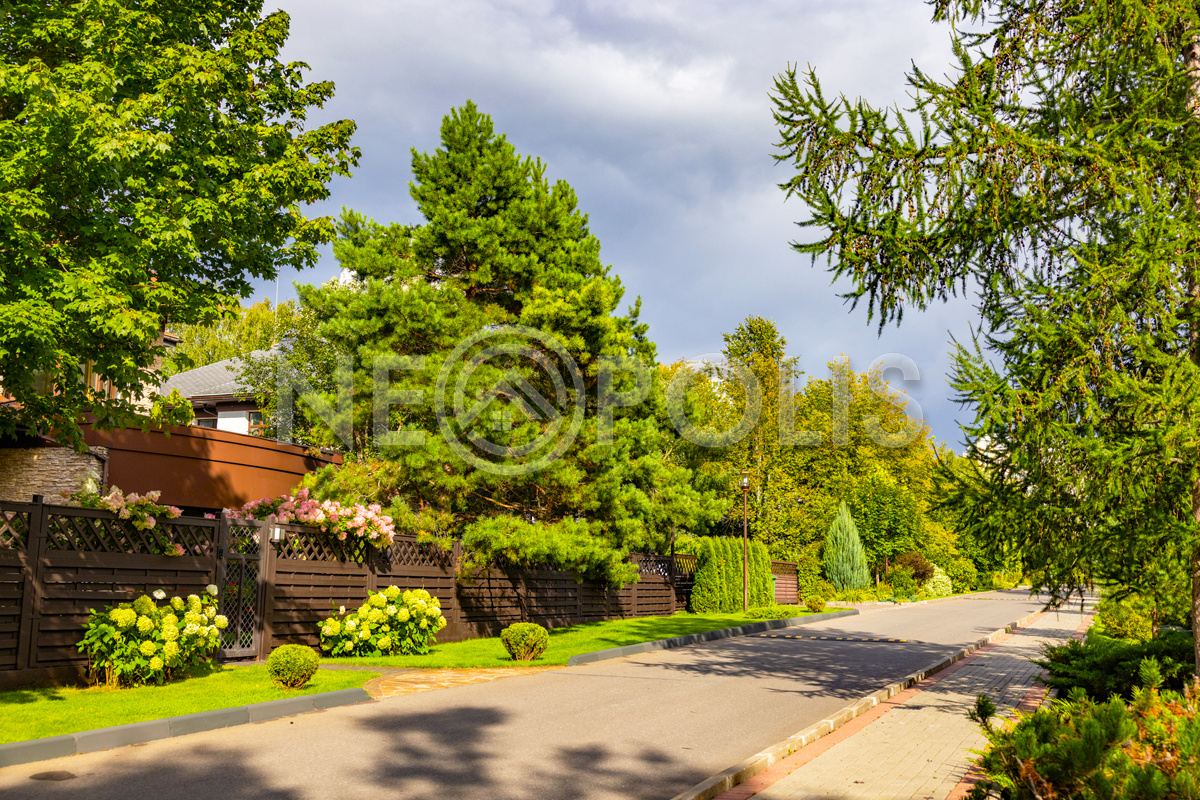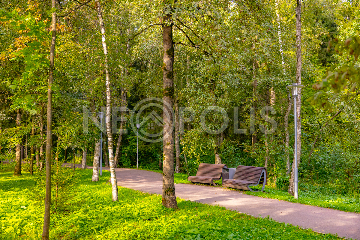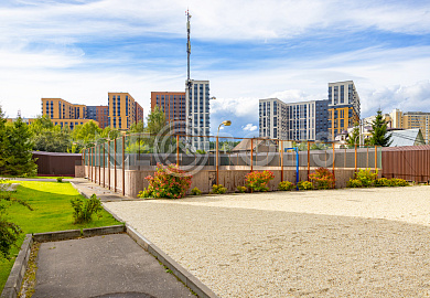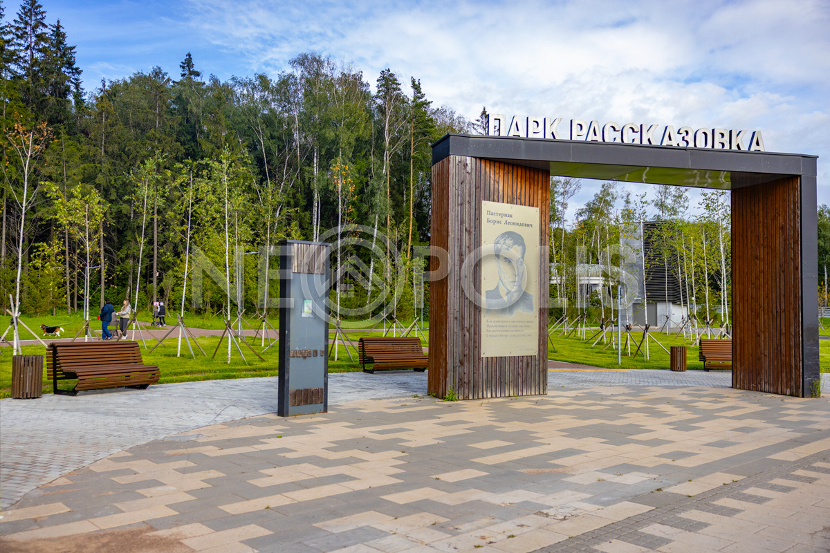 Внутри широкие, асфальтированные дороги, уличное освещение, гостевая парковка, пешеходные зоны, детская и спортивная площадки, вход в парк "Рассказовка".