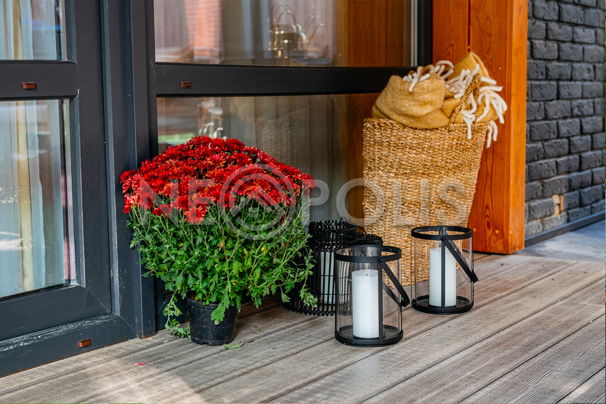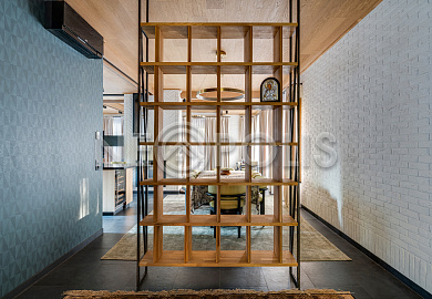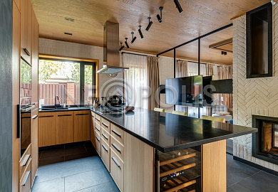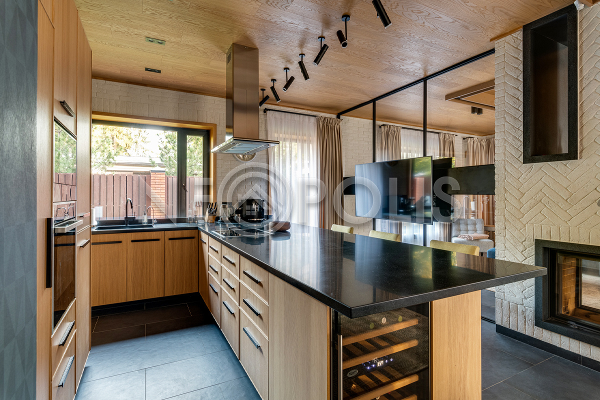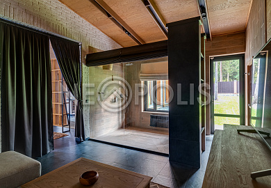 - Материал стен кирпич, фасад отделан камнем и лиственницей, внутренние стены отделаны деревом (лиственница), искусственным камнем, нержавеющей сталью и коллекционными обоями.