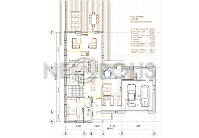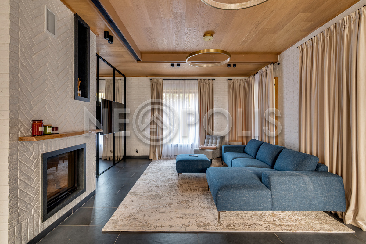 - 1 этаж:прихожая, гардеробная, кухня – столовая, гостиная с двусторонним камином и выходом на террасу, гостевая спальня с ванной комнатой, сауна, комната отдыха, душевая, санузел, постирочная, гараж на 2 авто, навес для садовой техники, котельная.