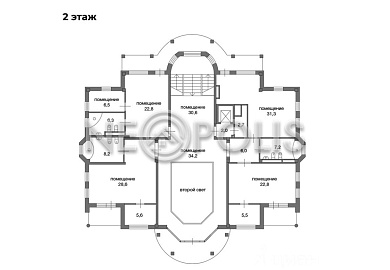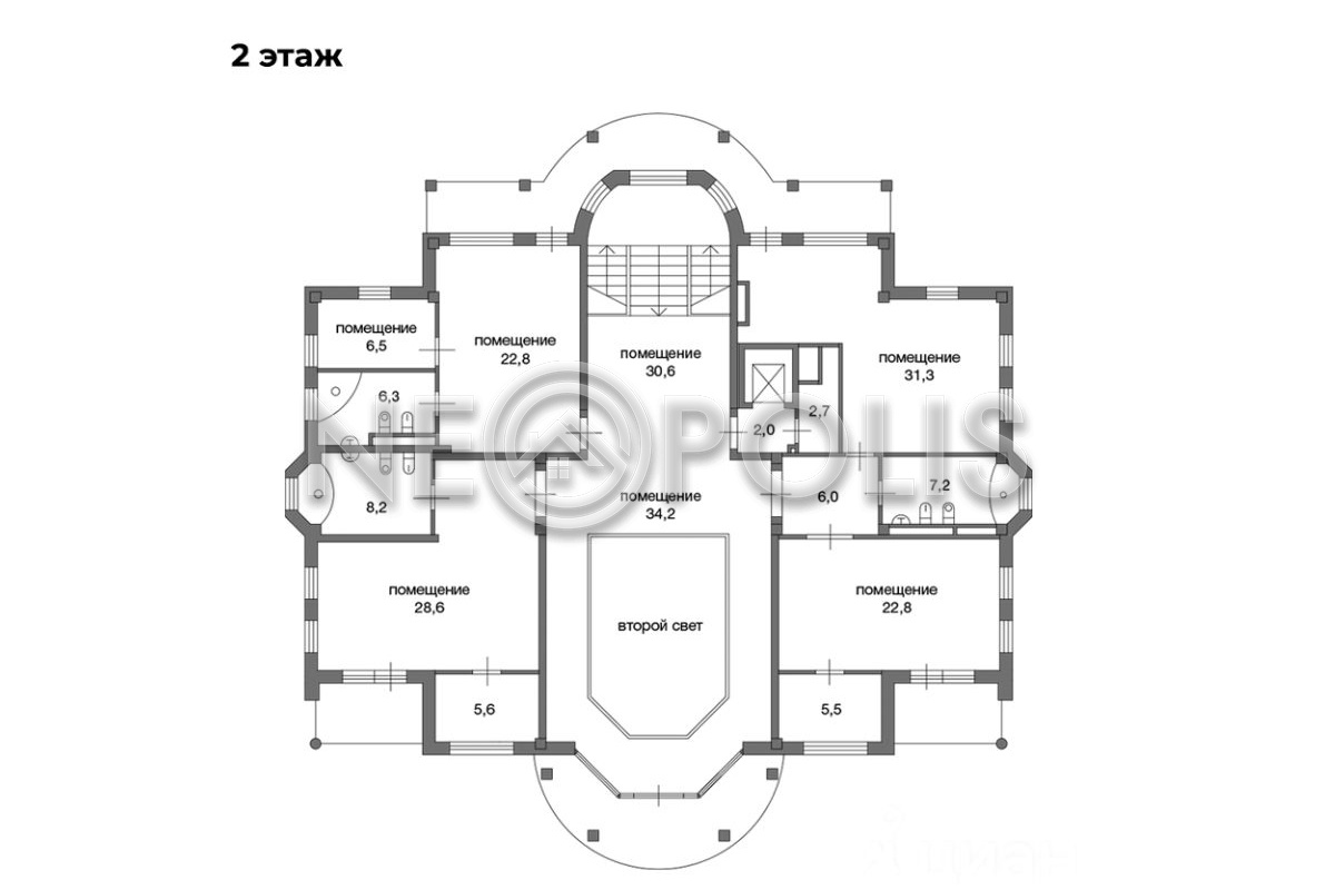 - 2 этаж:холл с выходом на балкон, мастер спальня с гардеробной, ванной комнатой и балконом, 2 спальни с гардеробными и ванными комнатами, комната отдыха с гардеробной и балконом.