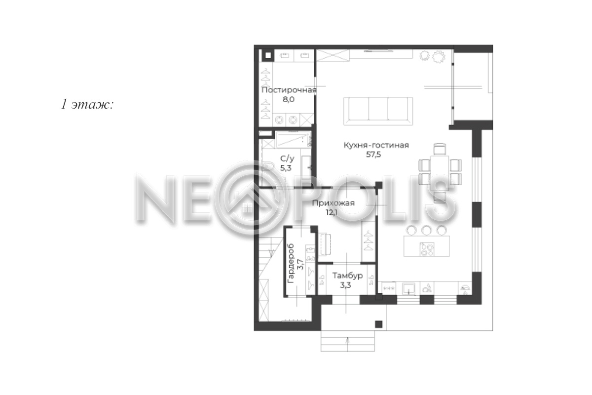 - 1 этаж:тамбур, прихожая с гардеробной, кухня-столовая, гостиная, спальня, санузел, постирочная.