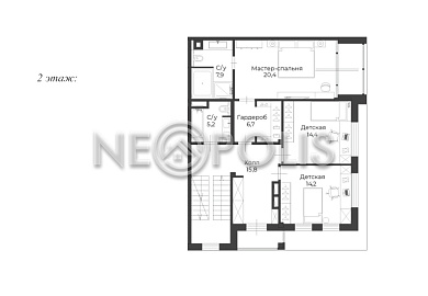 - 2 этаж:холл, мастер спальня с гардеробной и ванной комнатой, 2 спальни, санузел.