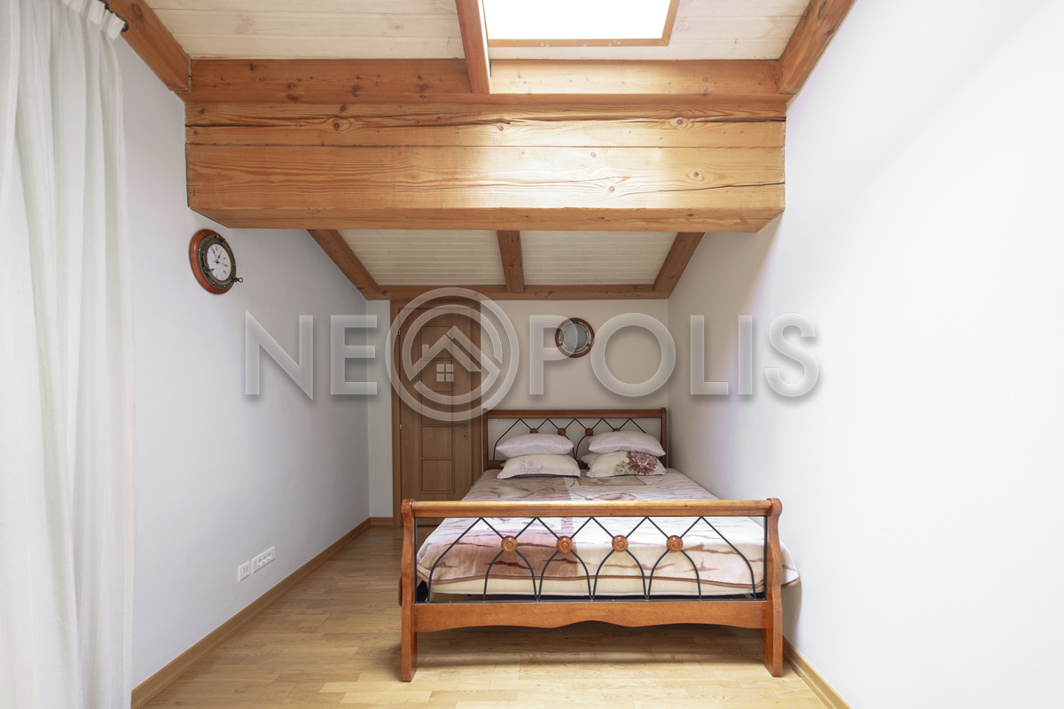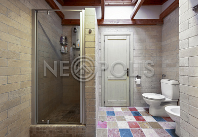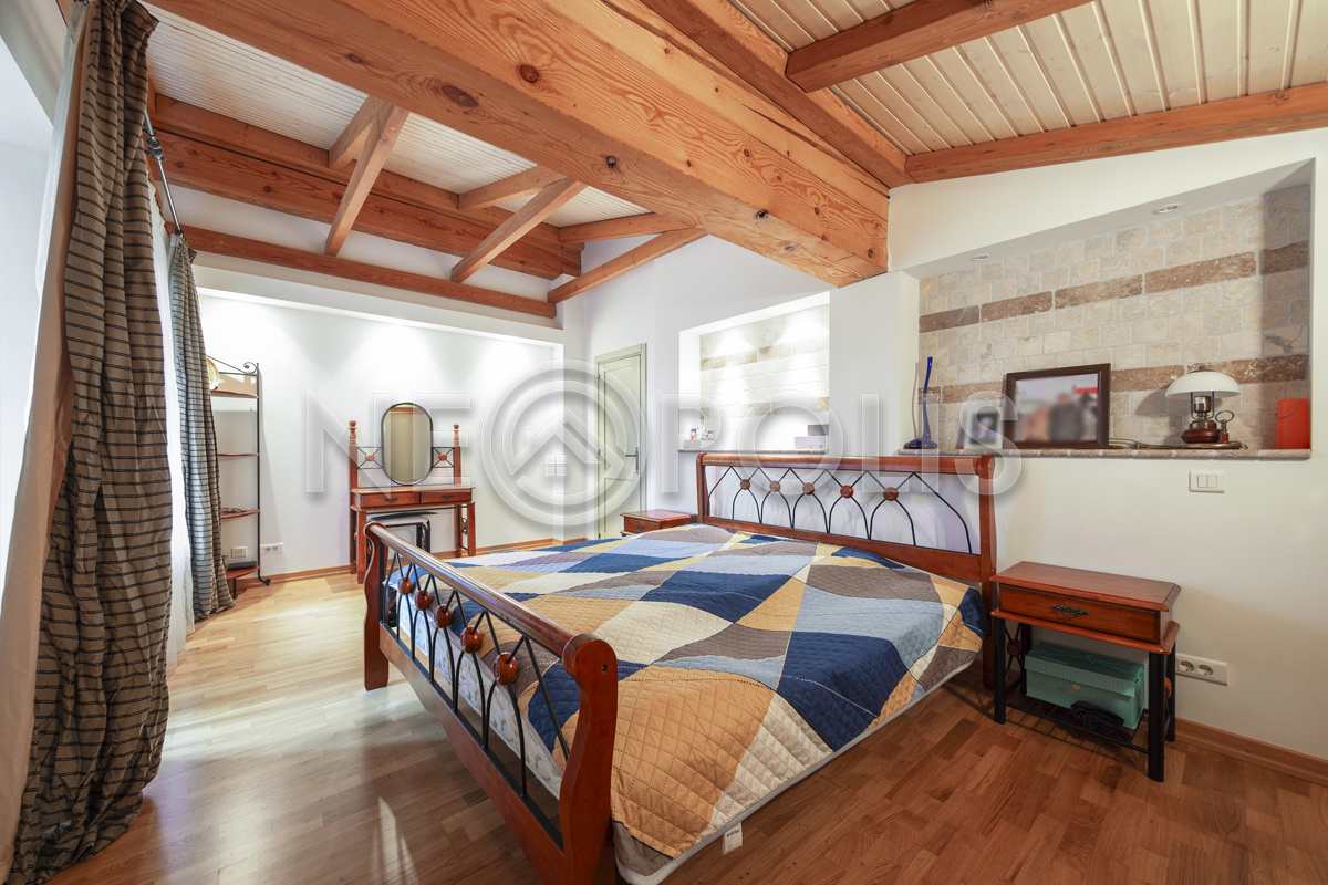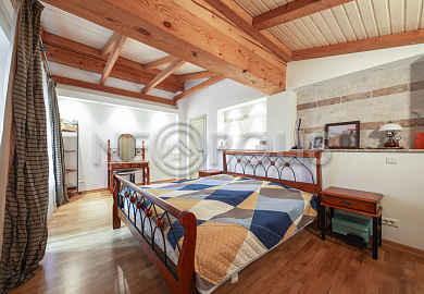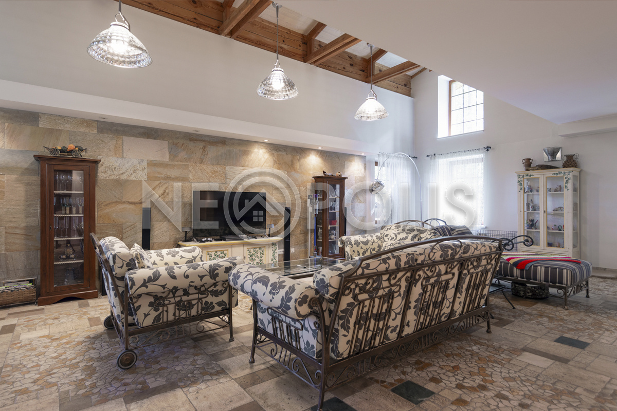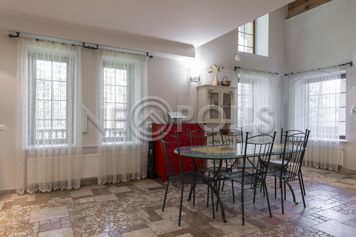 - 1 этаж:тамбур, холл, кухня-столовая с выходом на террасу (108.6 кв.м.), гостиная со вторым светом и дровяным камином, две спальни, санузел, прачечная, котельная с отдельным входом с улицы.