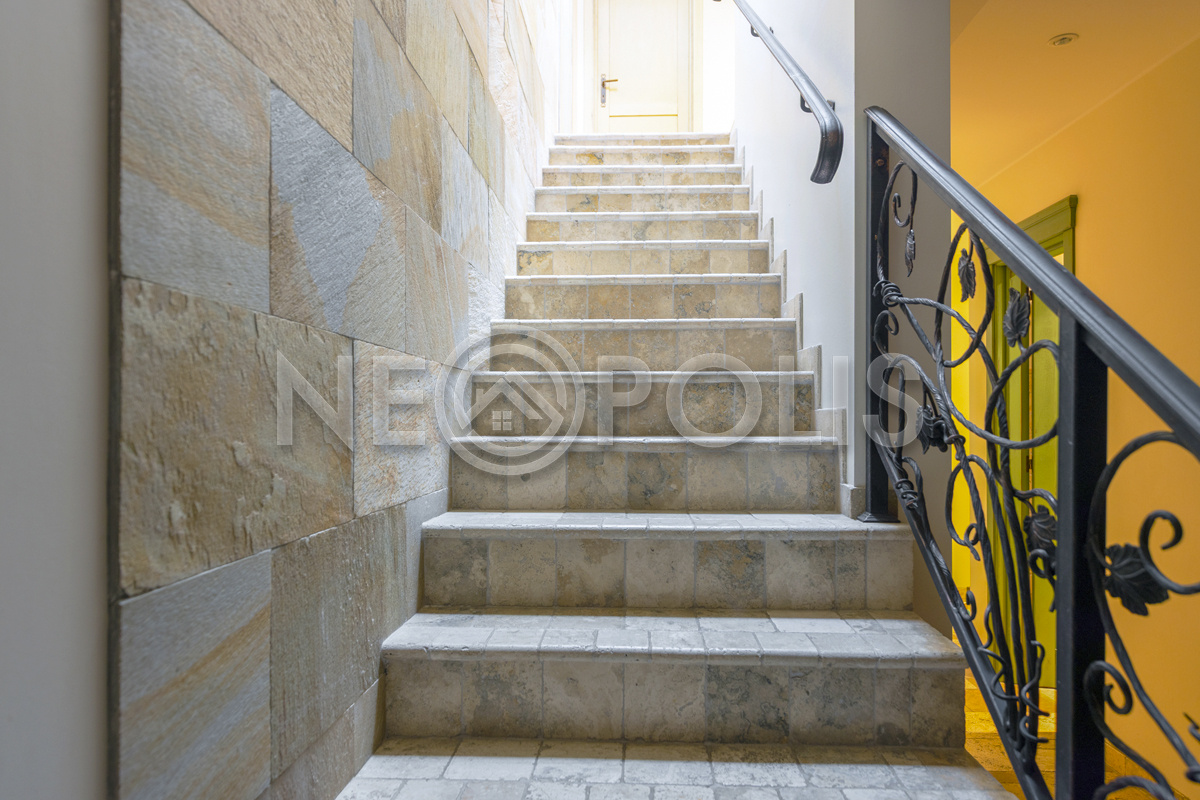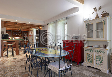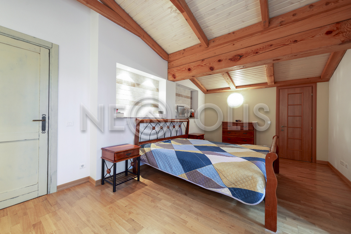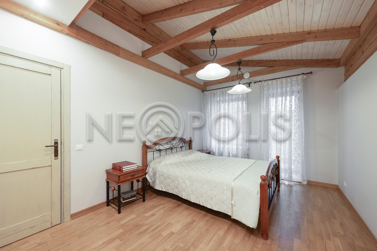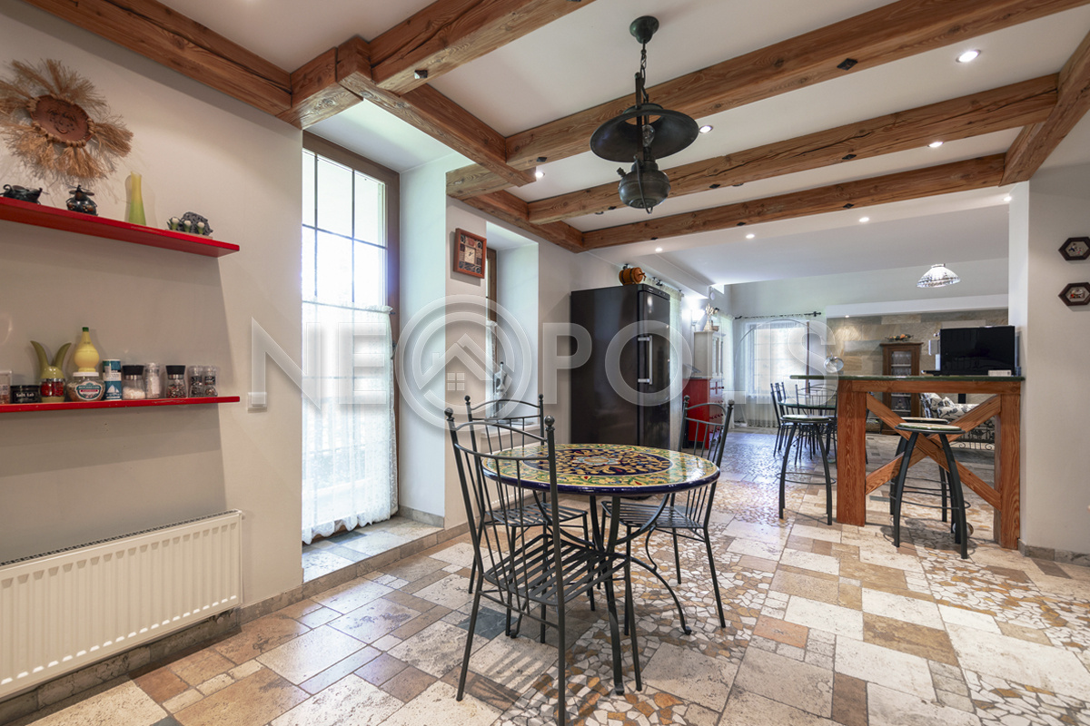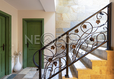 - 1 этаж:тамбур, холл, кухня-столовая с выходом на террасу (108.6 кв.м.), гостиная со вторым светом и дровяным камином, две спальни, санузел, прачечная, котельная с отдельным входом с улицы.