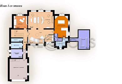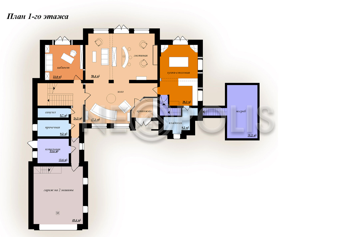 - 1 этаж:холл, кухня-столовая, гостиная, кабинет, санузел, прачечная, котельная, гараж на 2 авто.