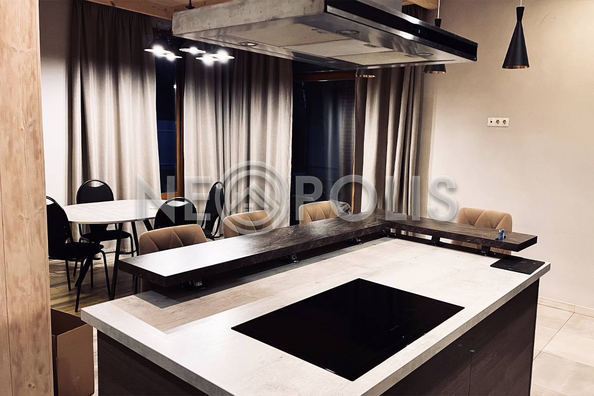 - 1 этаж:просторный холл, кухня-столовая, гостиная с камином и выходом на террасу к зоне барбекю, кабинет, санузел, котельная.
