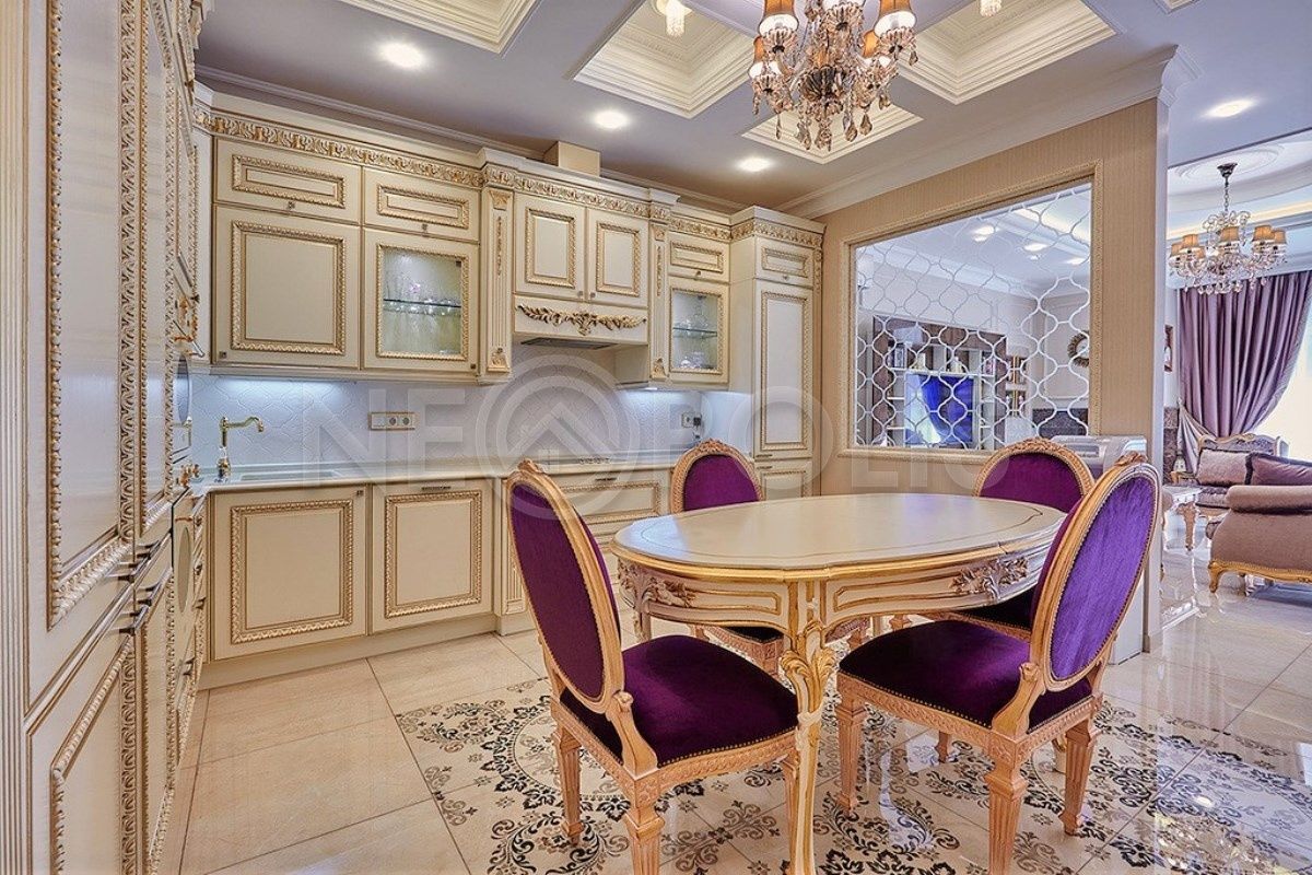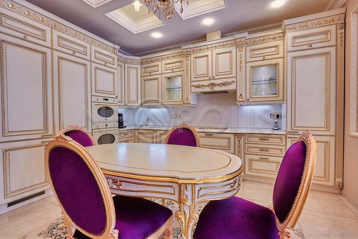 дорогая и эксклюзивная, изготовлена на заказ в Италии, фурнитура марки Swarovski, кухня встроенная, ручной работы, столешница – мрамор