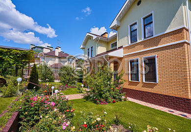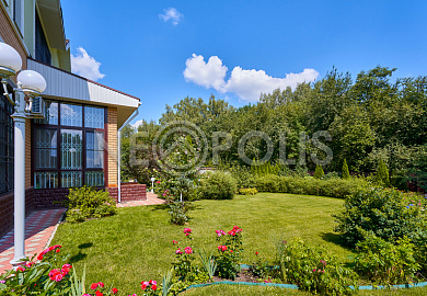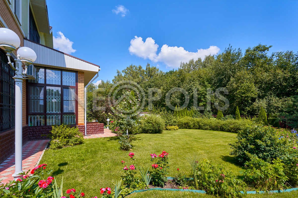 На участке растут хвойные и декоративные деревья, облагорожены клумбы.