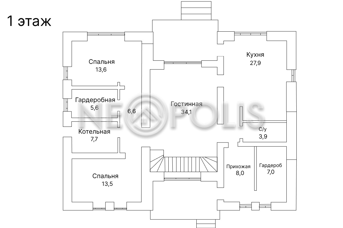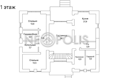 - 1 этаж:прихожая с гардеробной, холл, кухня-столовая, гостиная, спальня, санузел, постирочная, котельная, крытая терраса.