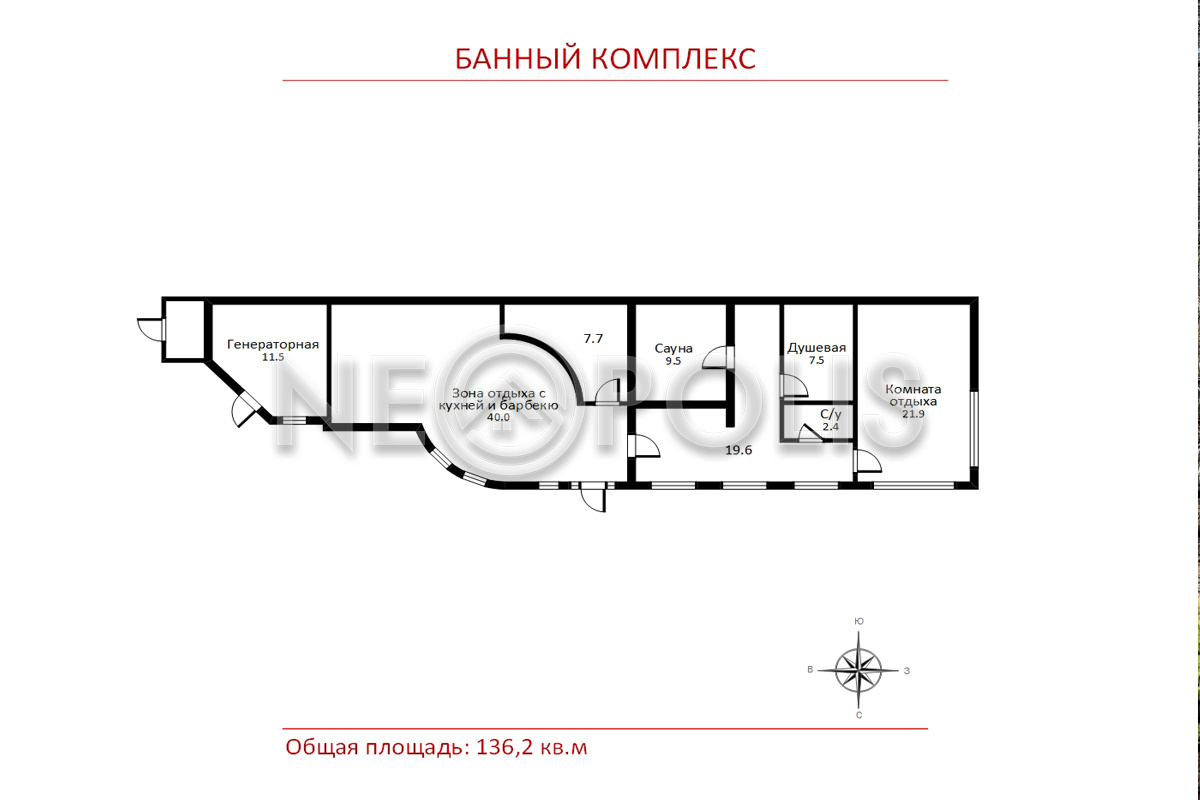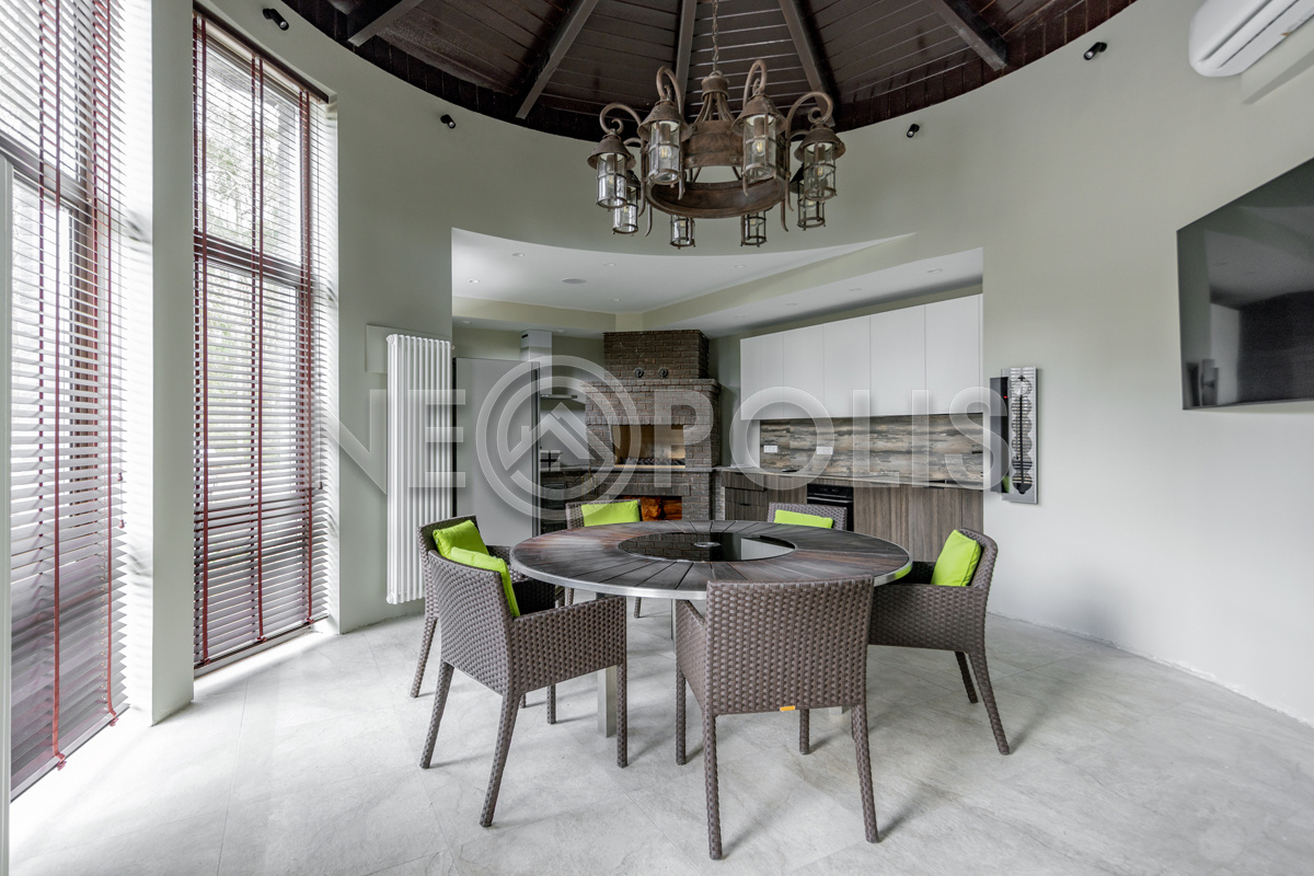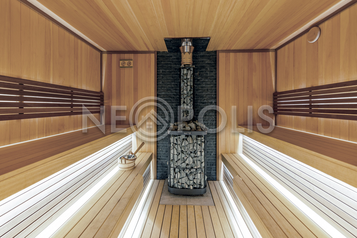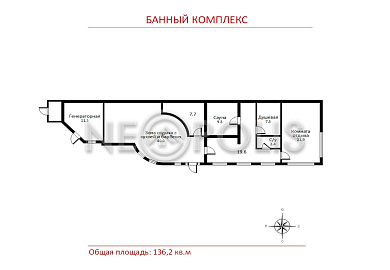 - Банный комплекс (136 кв.м.) с полноценной сауной, уютной комнатой отдыха, кухней и зоной барбекю. В комплексе тёплые полы, отопление от котельной дома, подключение к центральной системе канализации посёлка. Холодная и горячая вода подаётся из котельной дома; холодная вода пригодна для употребления.