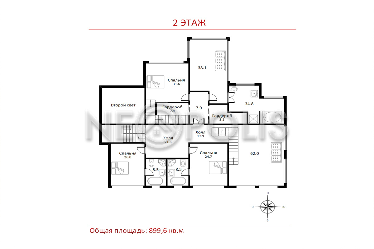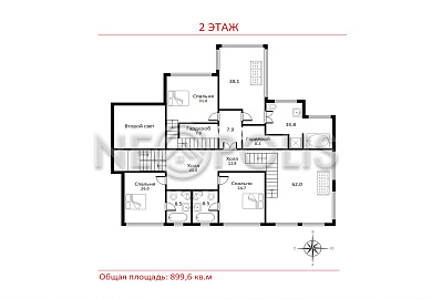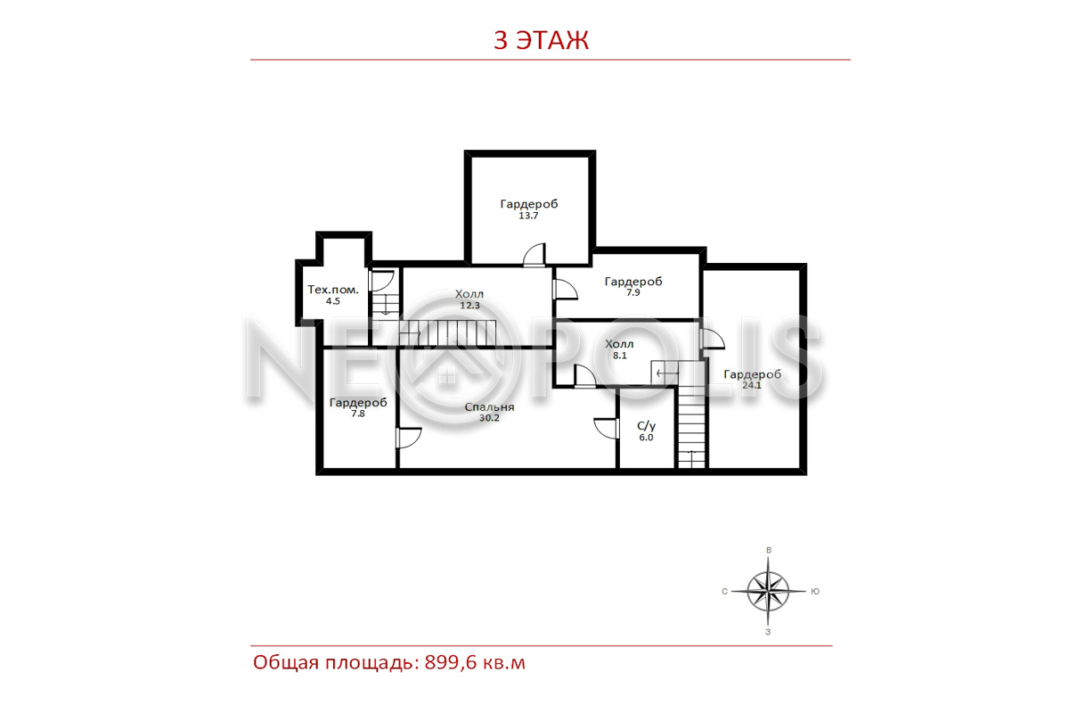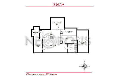 - Мансарда:спальня с ванной и гардеробной, две гардеробные, техническое помещение.