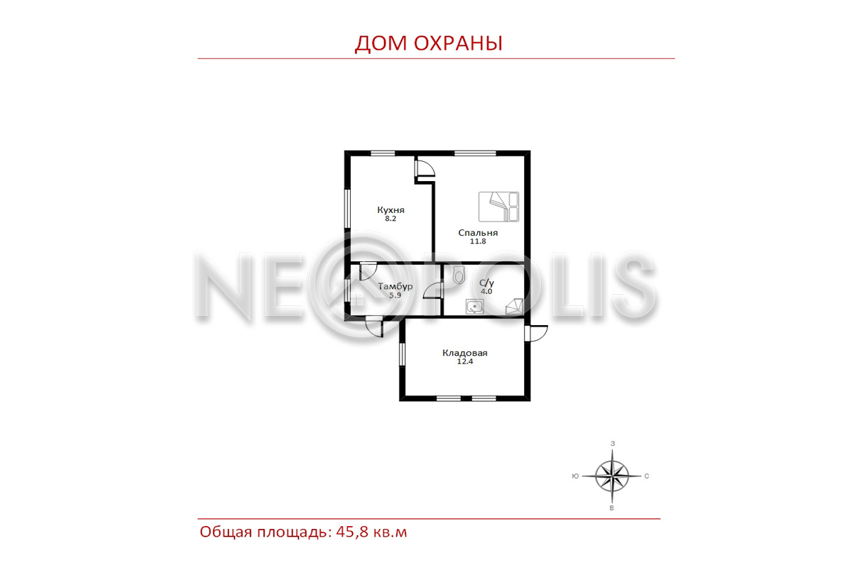 - Одноэтажный дом для персонала с кухней-гостиной, спальней и санузлом с душевой кабиной.