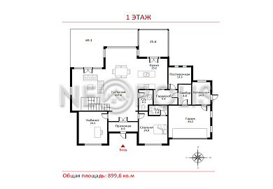 - 1-й этаж:прихожая, гостиная с камином и вторым светом, кухня‑столовая с выходом на террасу, холл, кабинет, гостевая спальня с санузлом, прихожая с гардеробной, зона прислуги (постирочная, гардероб, котельная с отдельным входом), гараж на 2 машиноместа. Выходы на открытую террасу из гостиной и столовой.