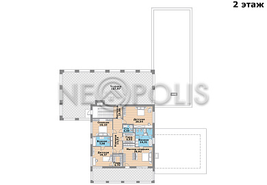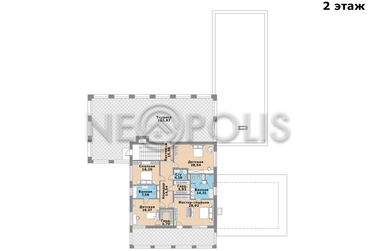 - 2 этаж:холл, мастер спальня с гардеробной и ванной комнатой и выходом на террасу, 3 спальни с гардеробными и ванными комнатами.