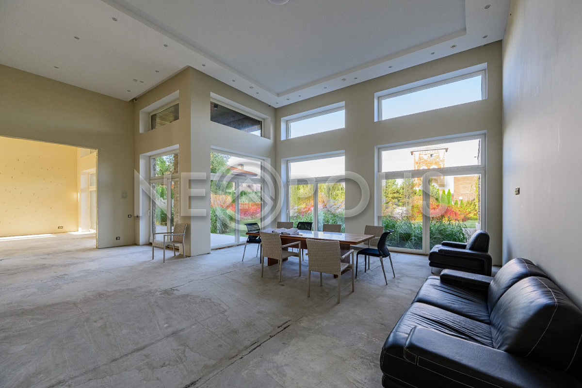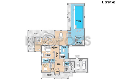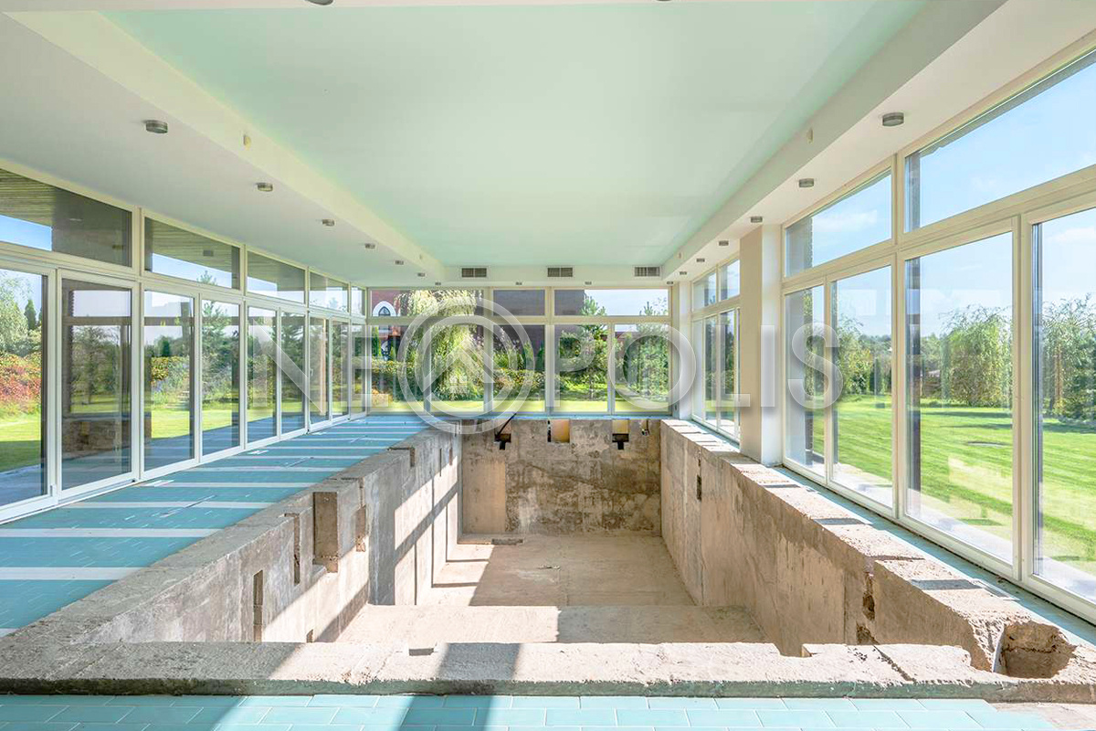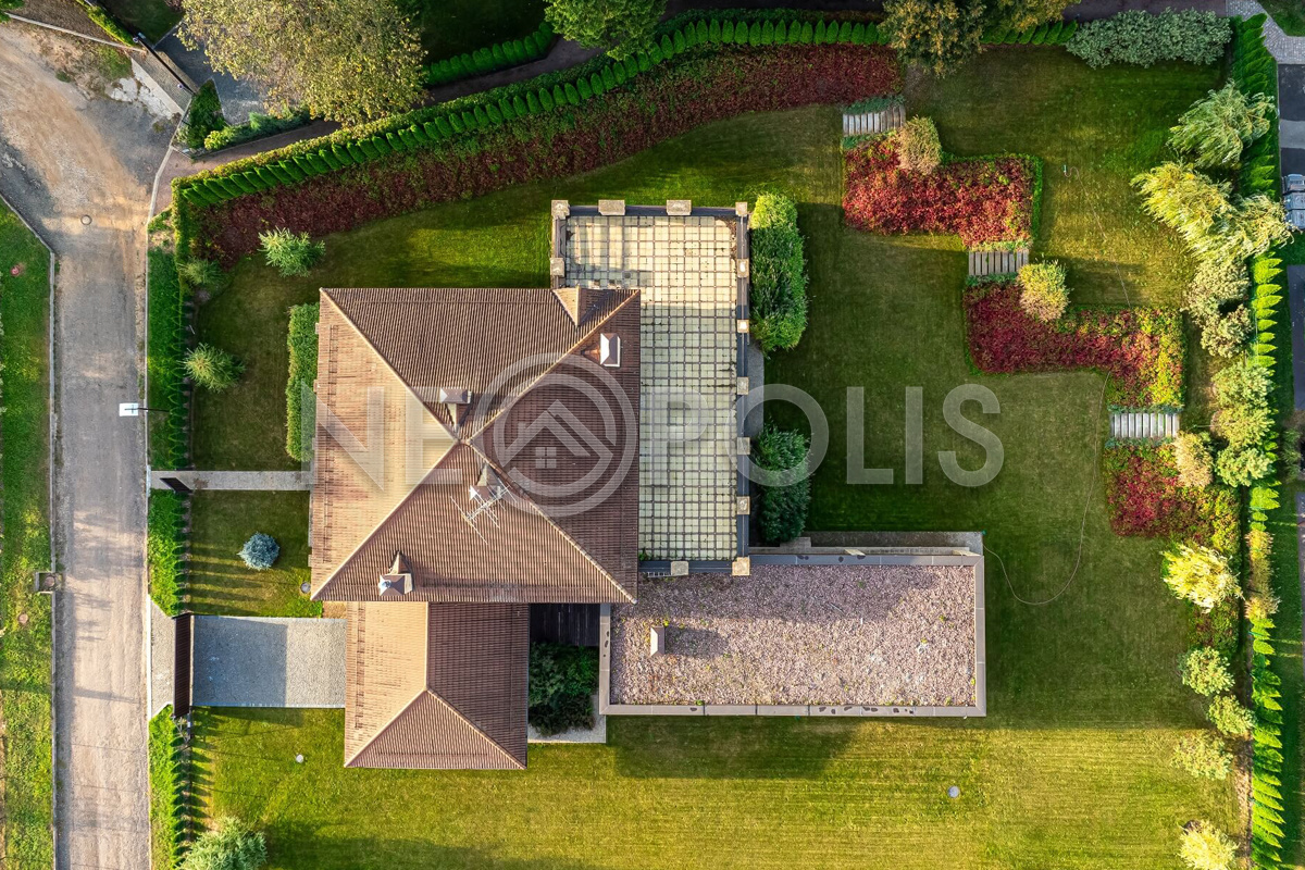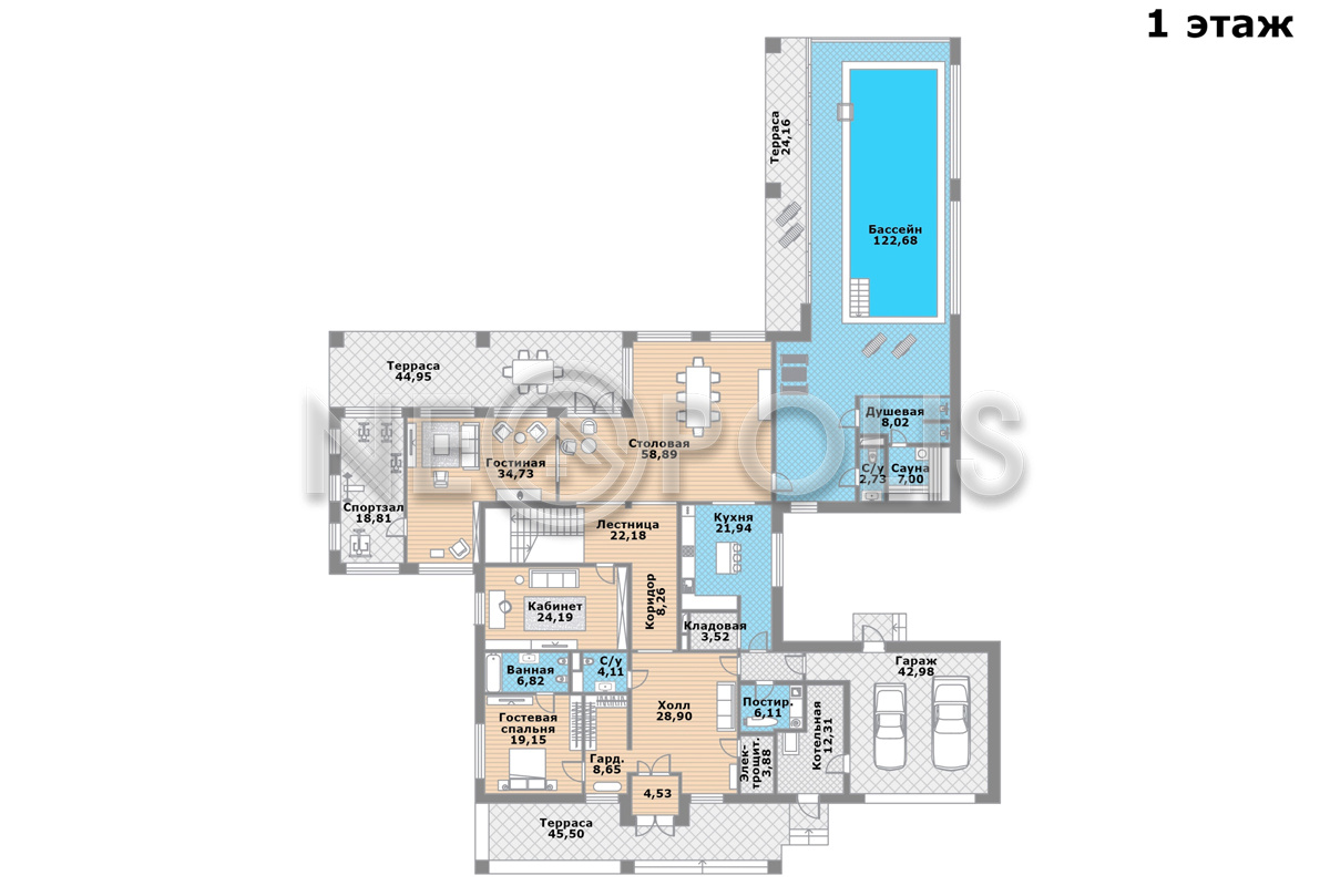 - 1 этаж:холл, кухня, столовая с выходом на террасу, гостиная с камином, спальня с гардеробной и ванной комнатой, кабинет, комната отдыха, санузел, SPA зона: бассейн с выходом на веранду, сауна, комната отдыха, санузел с душевой; котельная, гараж на 2 авто.