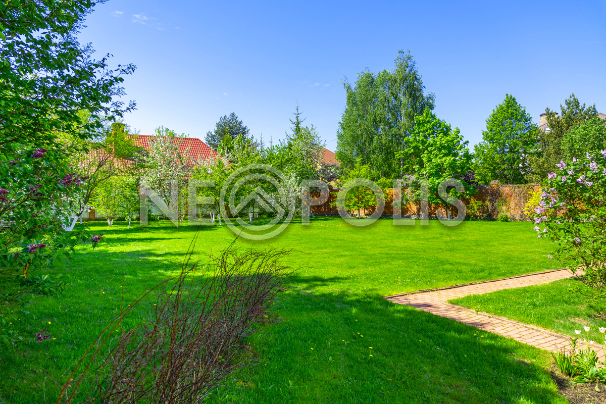 Облагороженный участок со множеством взрослых декоративных и плодовых деревьев, организована система автополива (9 контуров) по всему участку, вымощены дорожки, газон.