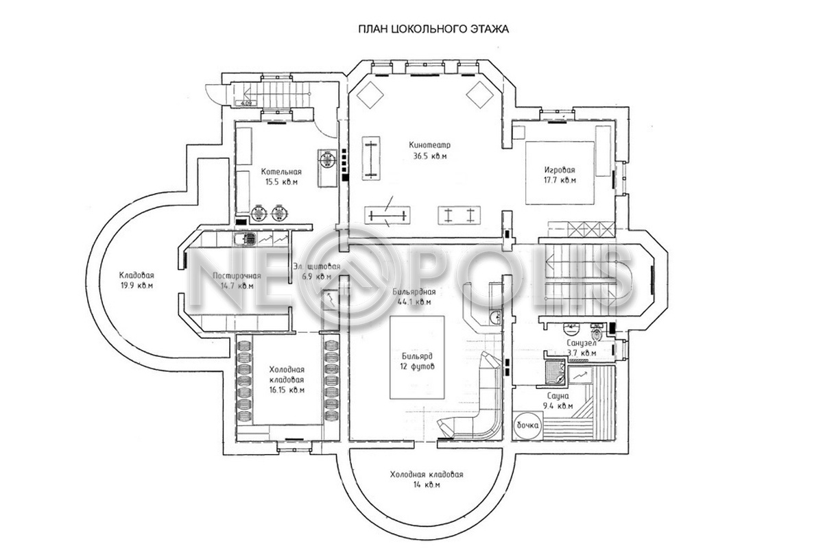 - Цоколь:холл, бильярдная, игровая + кинозал, сауна с бочкой, санузел с душевыми, две холодных кладовых, постирочная с кладовой, электрощитовая, котельная.