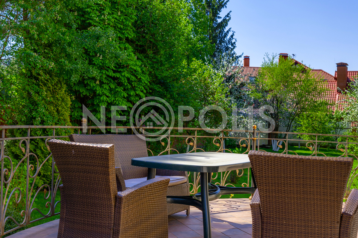Домик для приема гостей 73,2 кв.м, капитальный, всесезонный, в стиле основного дома, с отапливаемой частью ок.40 кв.м (отапливается электричеством - теплые эл. полы и конвекторы, окна ПВХ, мягкая кровля), в которой полностью оборудованная мебелью и техникой кухня-столовая, кладовая, гостевой санузел и неотапливаемой крытой незастекленной частью - с мангалом. В обеих частях - электричество, водопровод, канализация. Итальянский кухонный гарнитур со встроенной техникой, обеденная зона, кондиционер Panasonic.