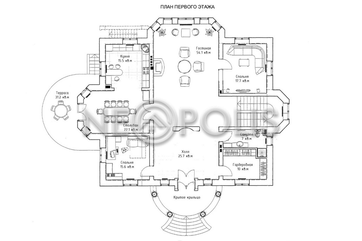 - 1 этаж:прихожая, холл, кухня, столовая с выходом на террасу, гостиная с камином и вторым светом, две спальни, гардеробная, санузел.