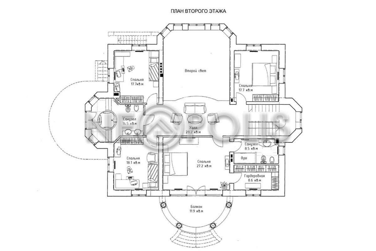 - 2 этаж:холл-галерея над вторым светом, мастер-спальня с гардеробной, ванной комнатой и балконом, три спальни, санузел.
