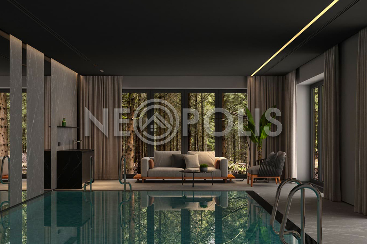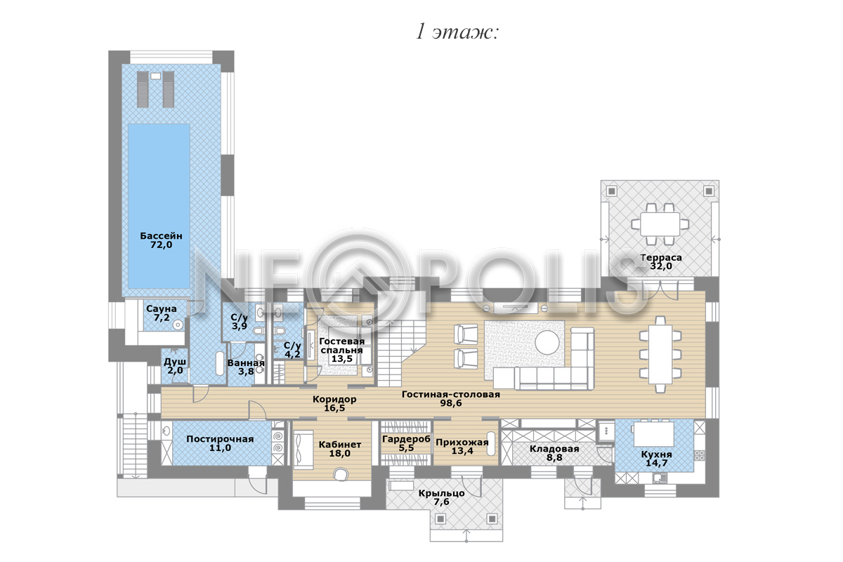- 1 этаж:крыльцо, прихожая с гардеробной, холл, кухня-столовая, гостиная с выходом на террасу, спальня с гардеробной и ванной комнатой, кабинет, кладовая и постирочная с дополнительными входами с улицы, SPA зона: бассейн 72кв.м., сауна, санузел, душевые.