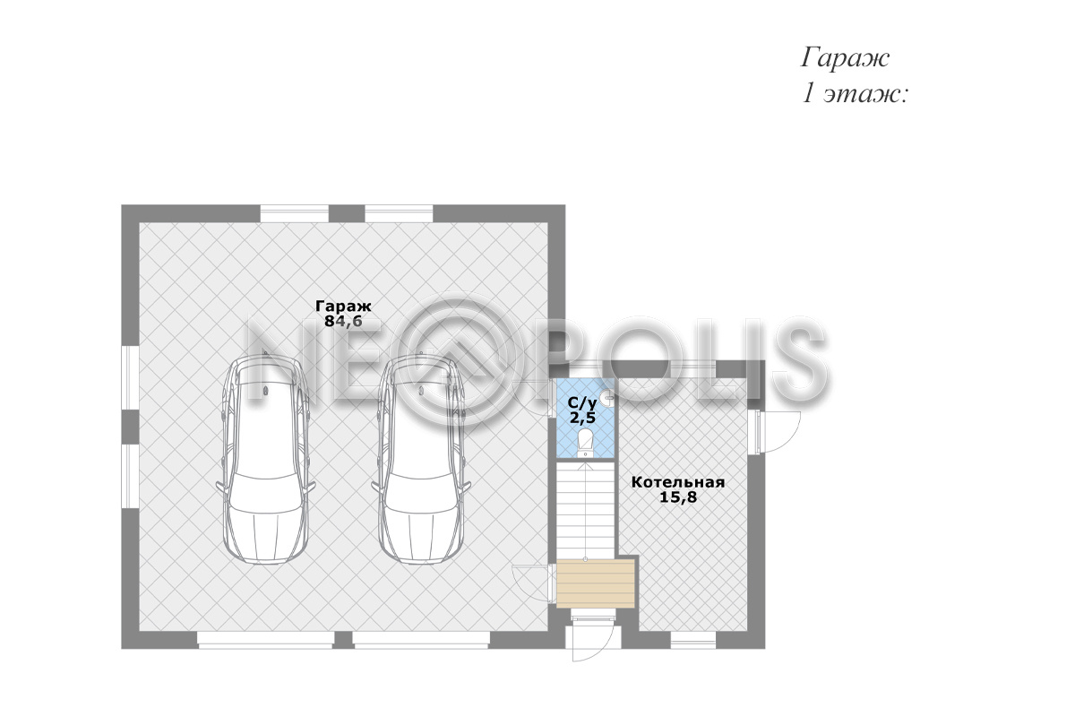 1 этаж: гараж на 2 авто 84,6 кв.м., санузел, котельная.