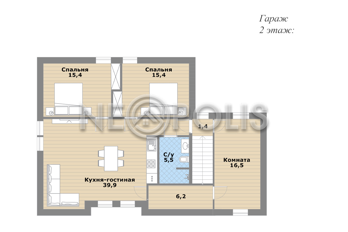 2 этаж: кухня-гостиная, 2 спальни, 2 комнаты свободного назначения, санузел.