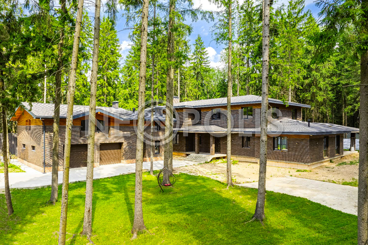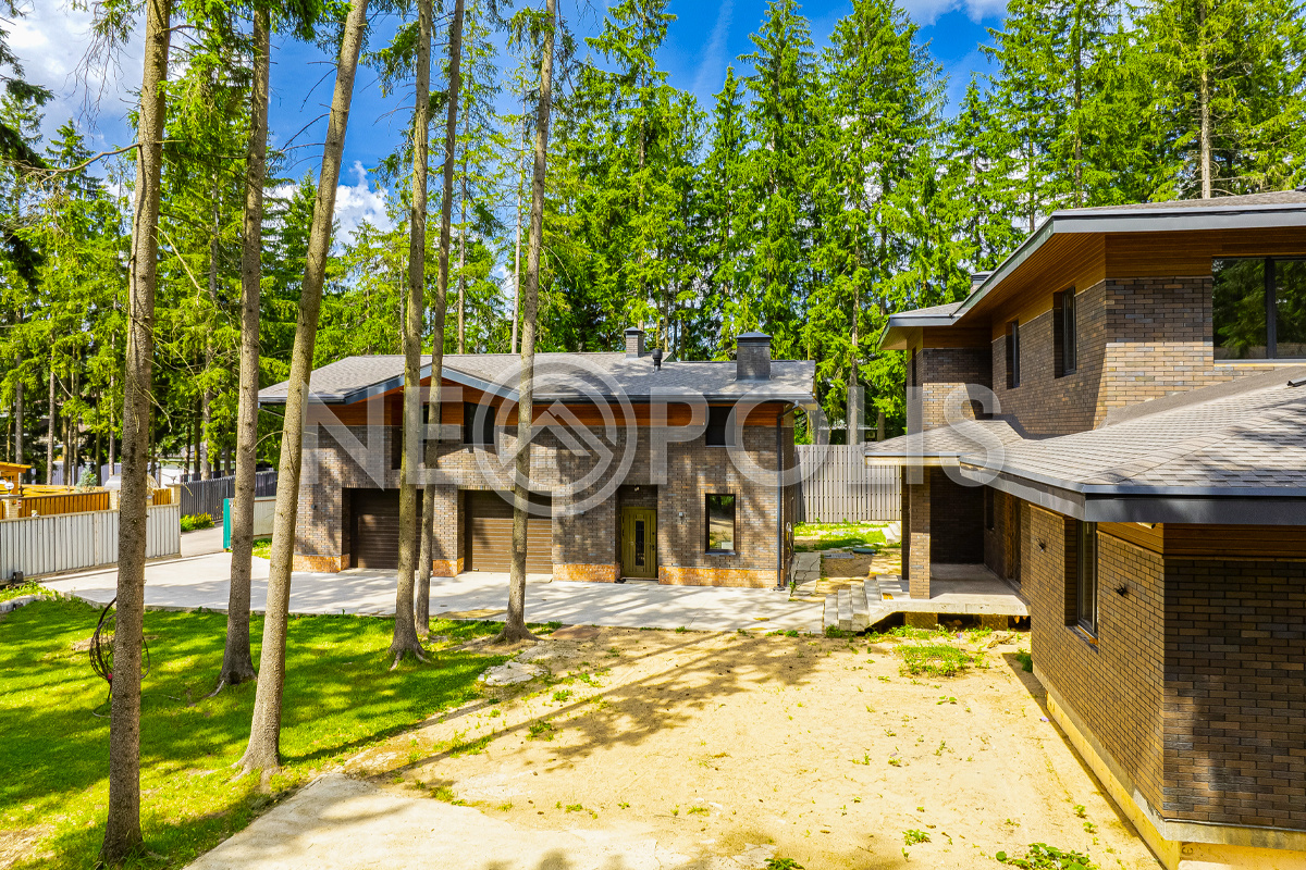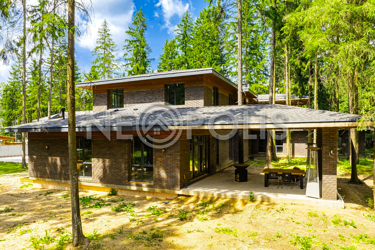 Приватный участок утопает в зелени, при строительстве были сохранены вековые сосны.