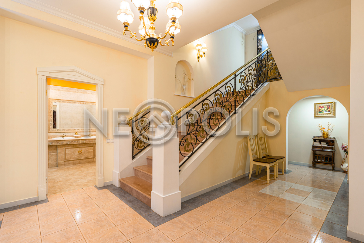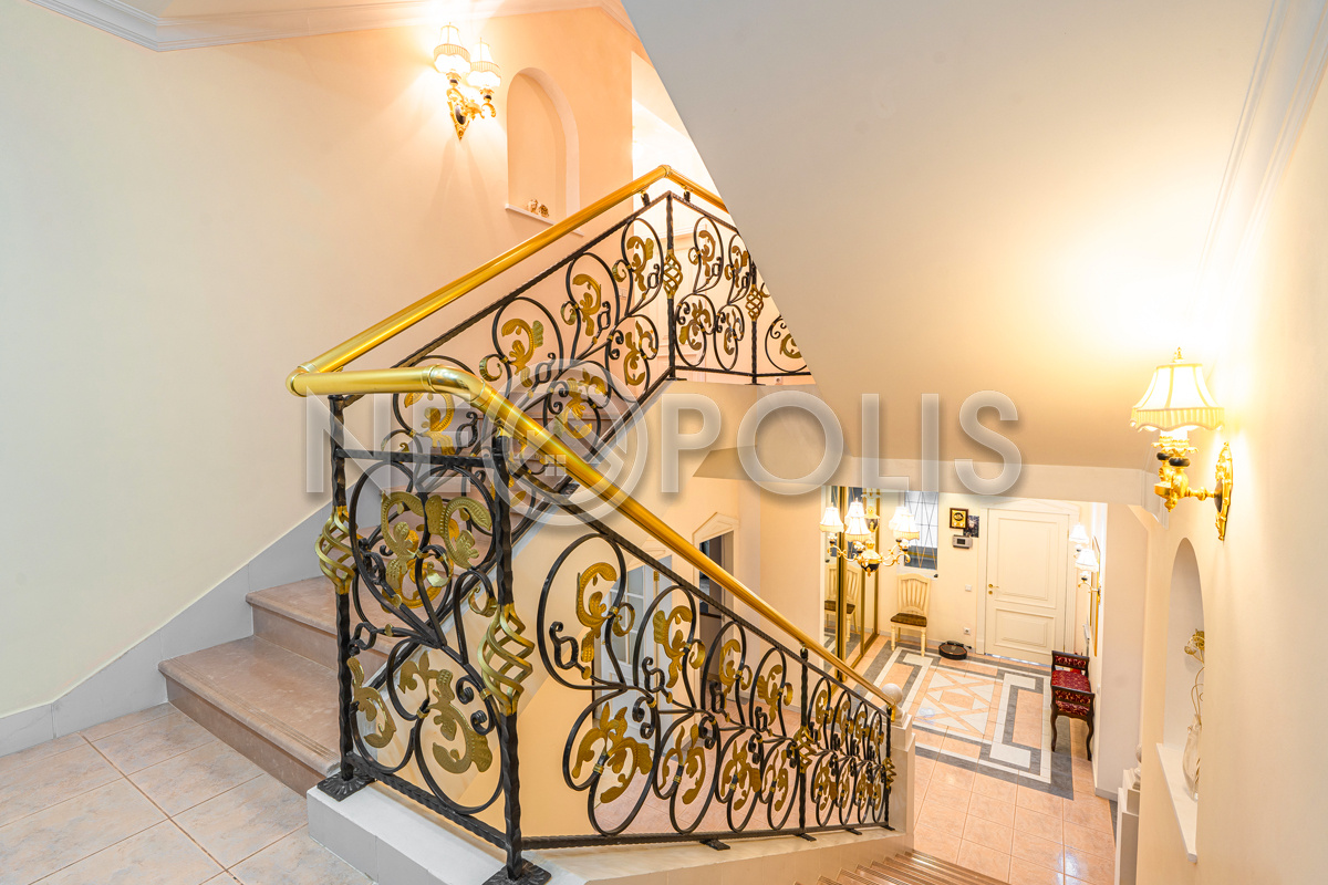 - Лестница: монолитное основание, ограждение - художественная ковка из итальянских каталогов, поручни - металлические под бронзу, ступени из искусственного акрилового камня