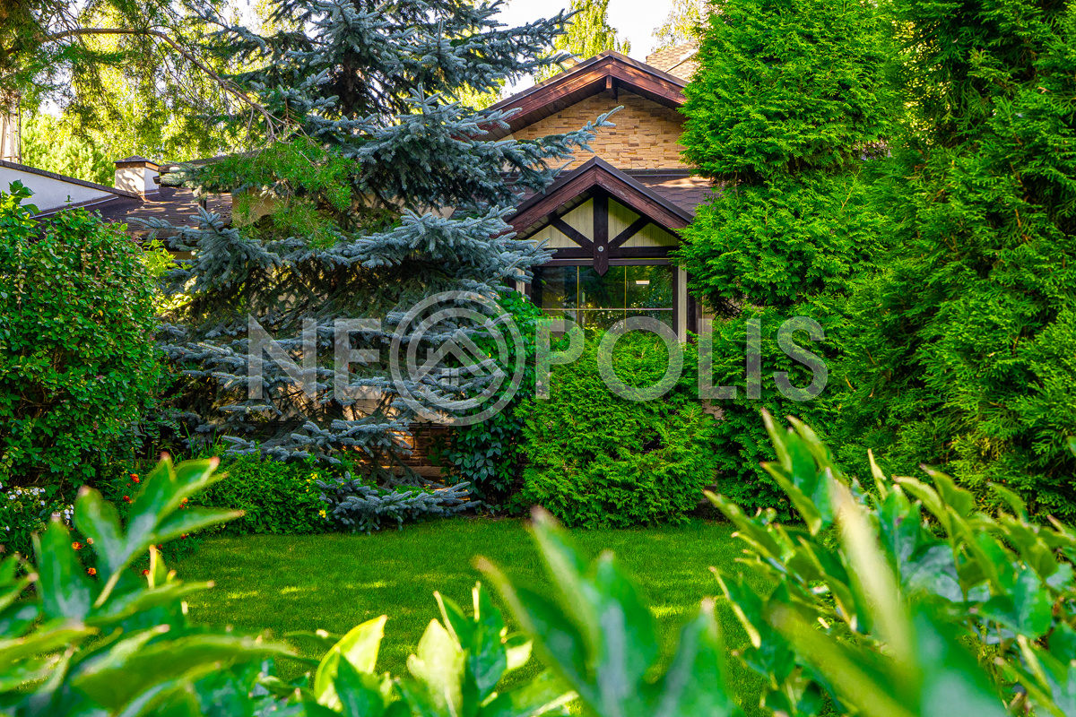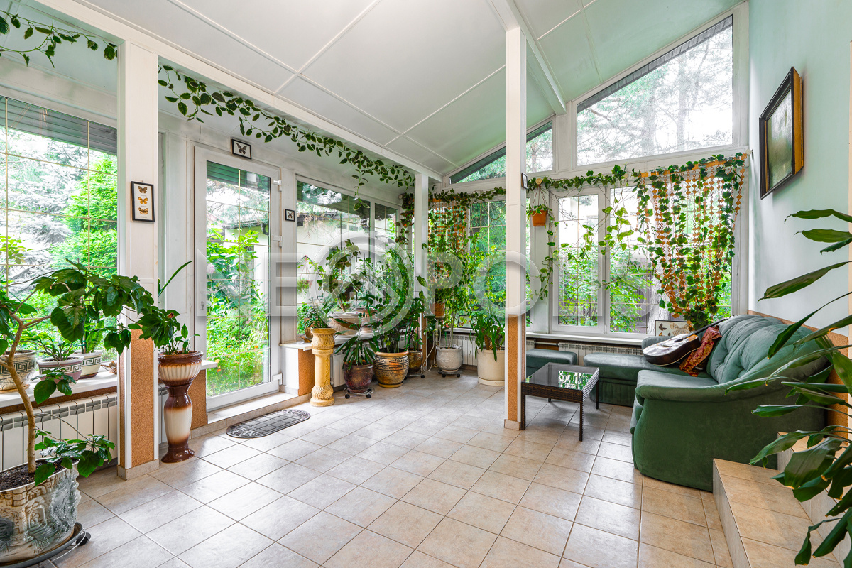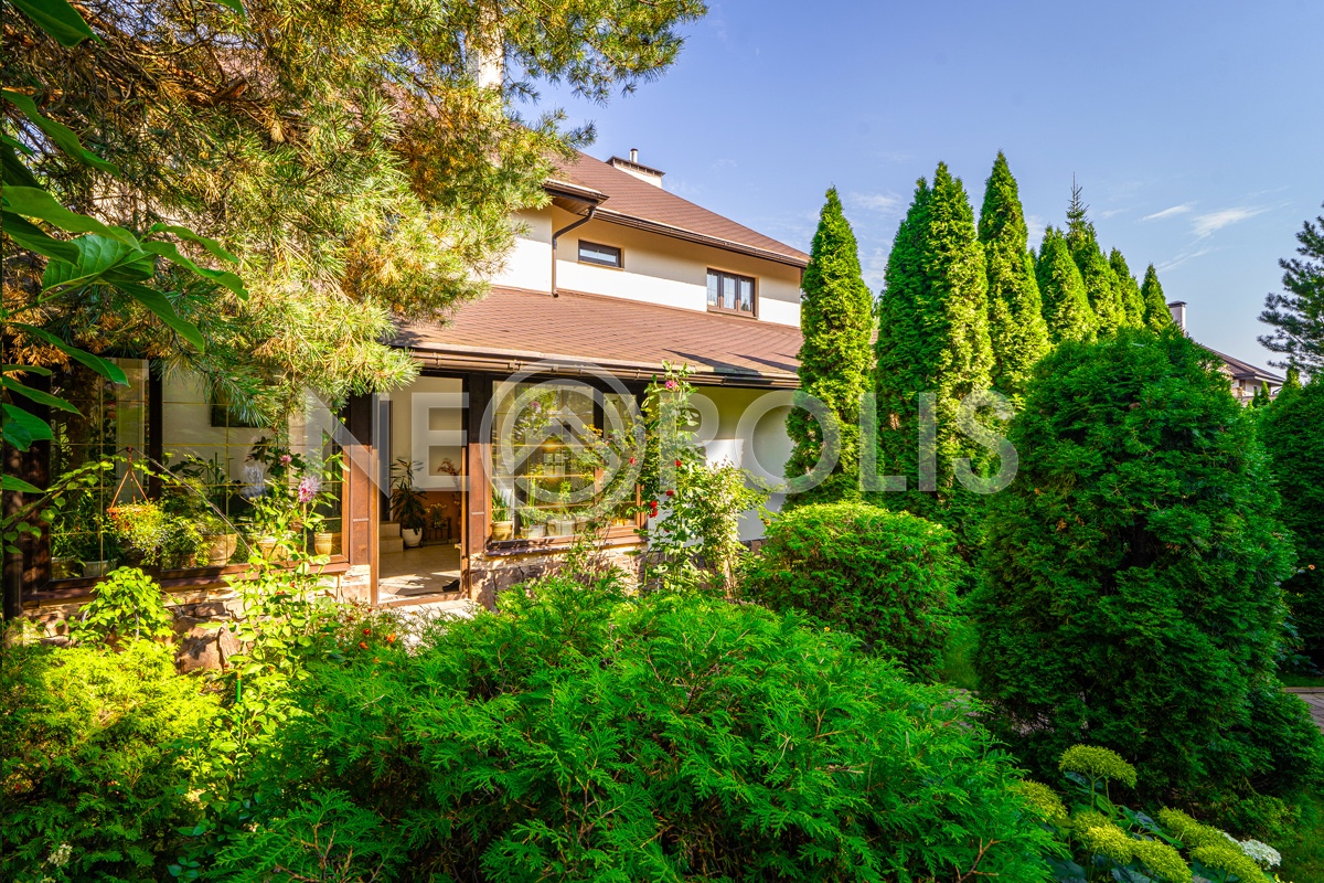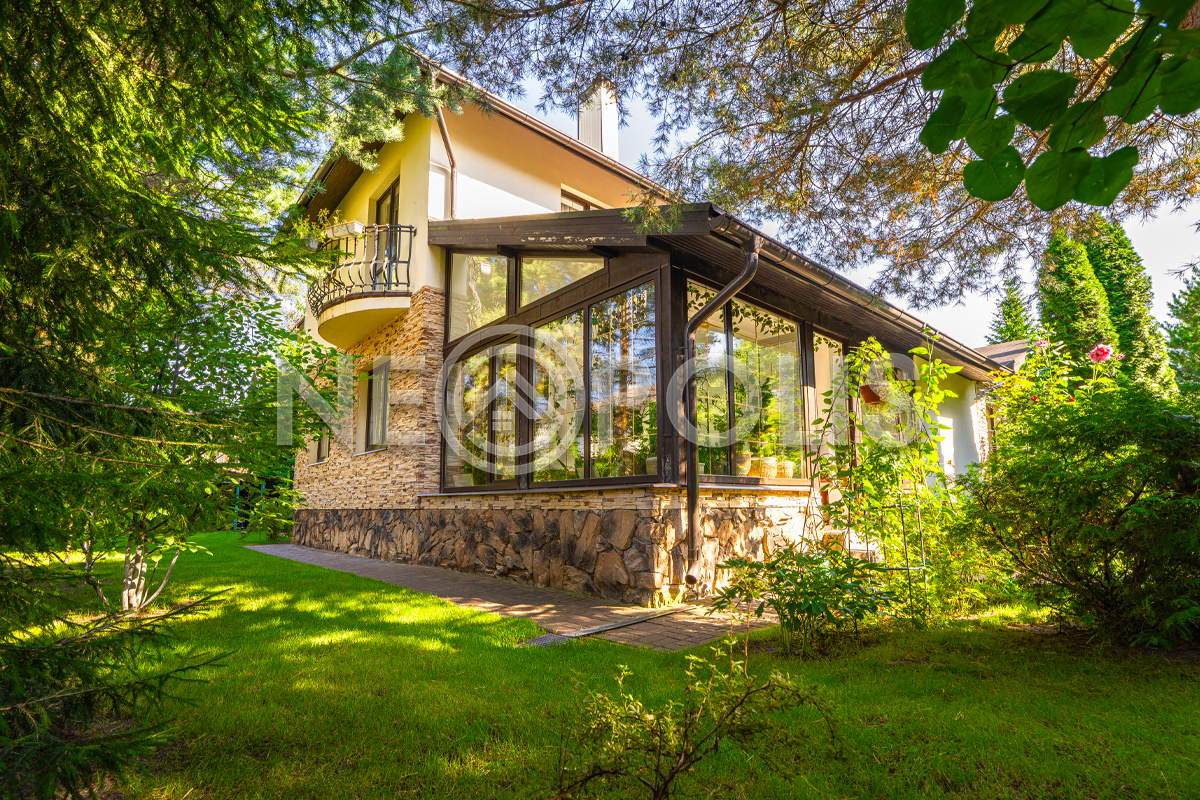 - Окна: стеклопакеты ПВХ (2-камерные с раскладкой Rehau, с ламинацией под дерево снаружи, внутри белые + панорамные окна в зимнем саду + мансардные окна)