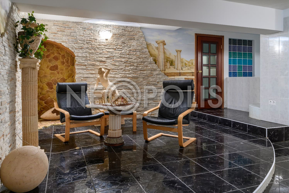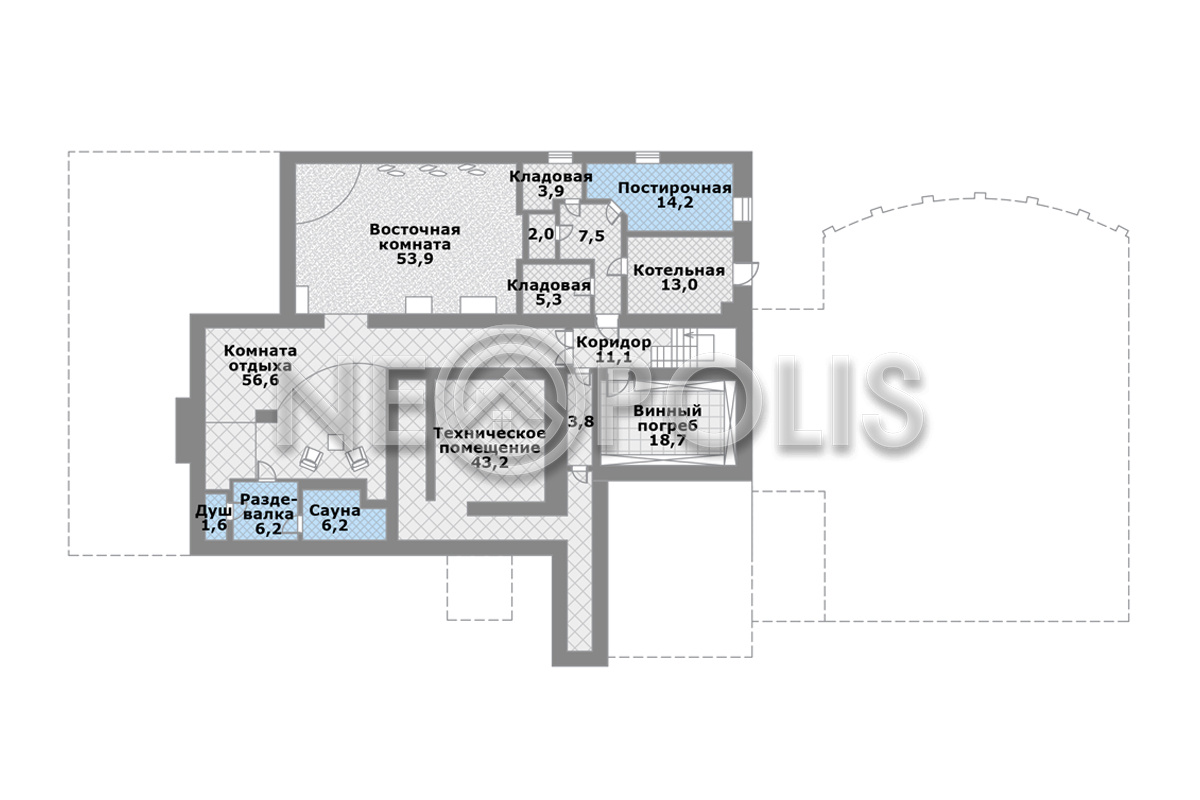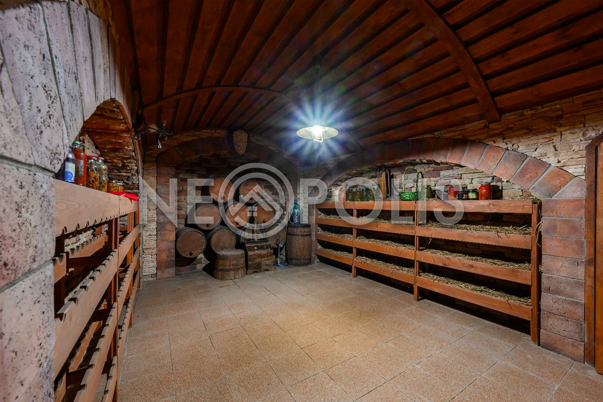 - Цоколь:коридор, комната отдыха с сауной, раздевалкой и душевыми, винный погреб, восточная комната, 2 кладовые, постирочная, технические помещения, котельная.