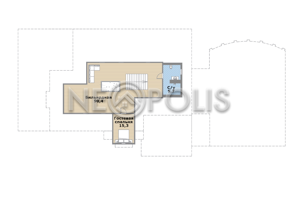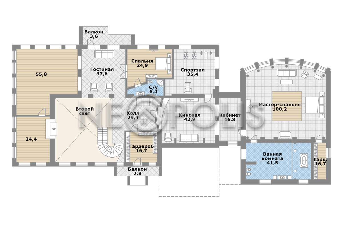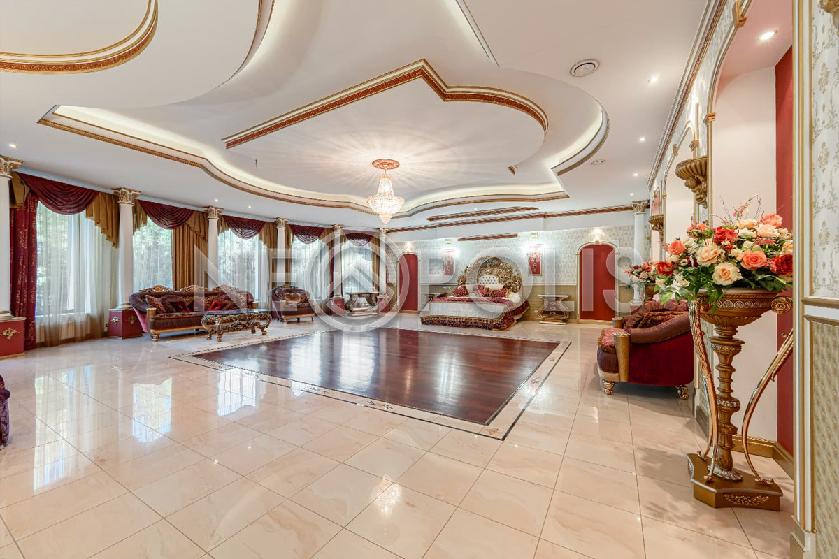 - 2 этаж:холл-гостиная со вторым светом и выходом на балкон, мастер-спальня с ванной комнатой, гардеробной и кабинет, спальня с ванной комнатой, гардеробная с выходом на балкон, зона домашнего кинотеатра, тренажерный зал, помещения свободного назначения.