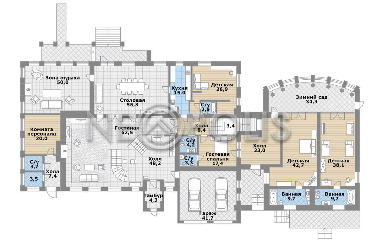 - 1 этаж:тамбур, холл, кухня, столовая с выходом на террасу, гостиная 62,5 кв.м., зона отдыха, 2 спальни с ванными комнатами и общим зимним садом, 2 спальни с ванными комнатами, 2 санузла, комната для персонала с ванной комнатой с отдельным входом.