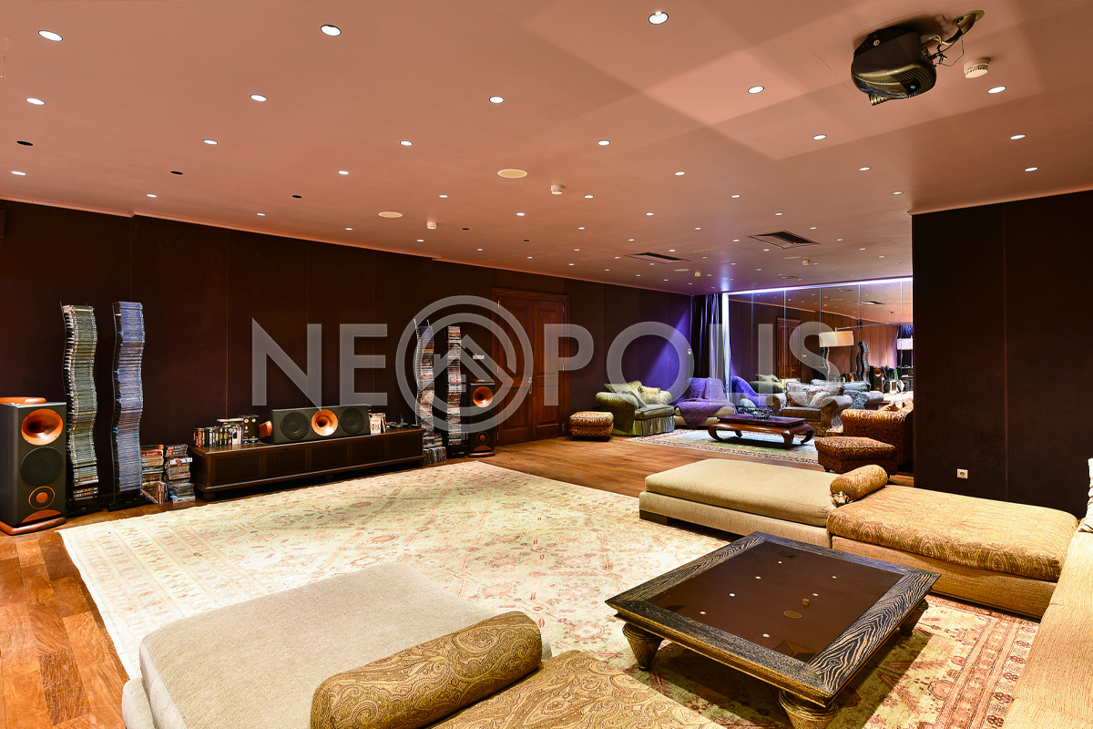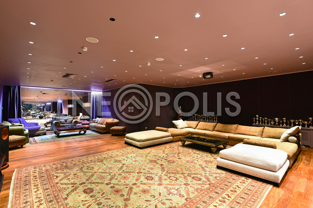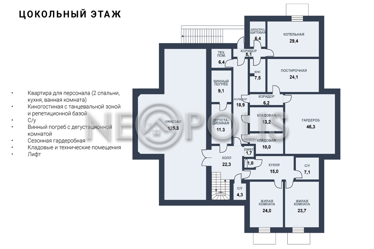 - Цоколь:холл, квартира для персонала (кухня, две спальни, ванная комната), киногостиная с танцевальной зоной и репетиционной базой, винный погреб с дегустационной, сезонная гардеробная, кладовые, технические помещения, лифт, санузел.