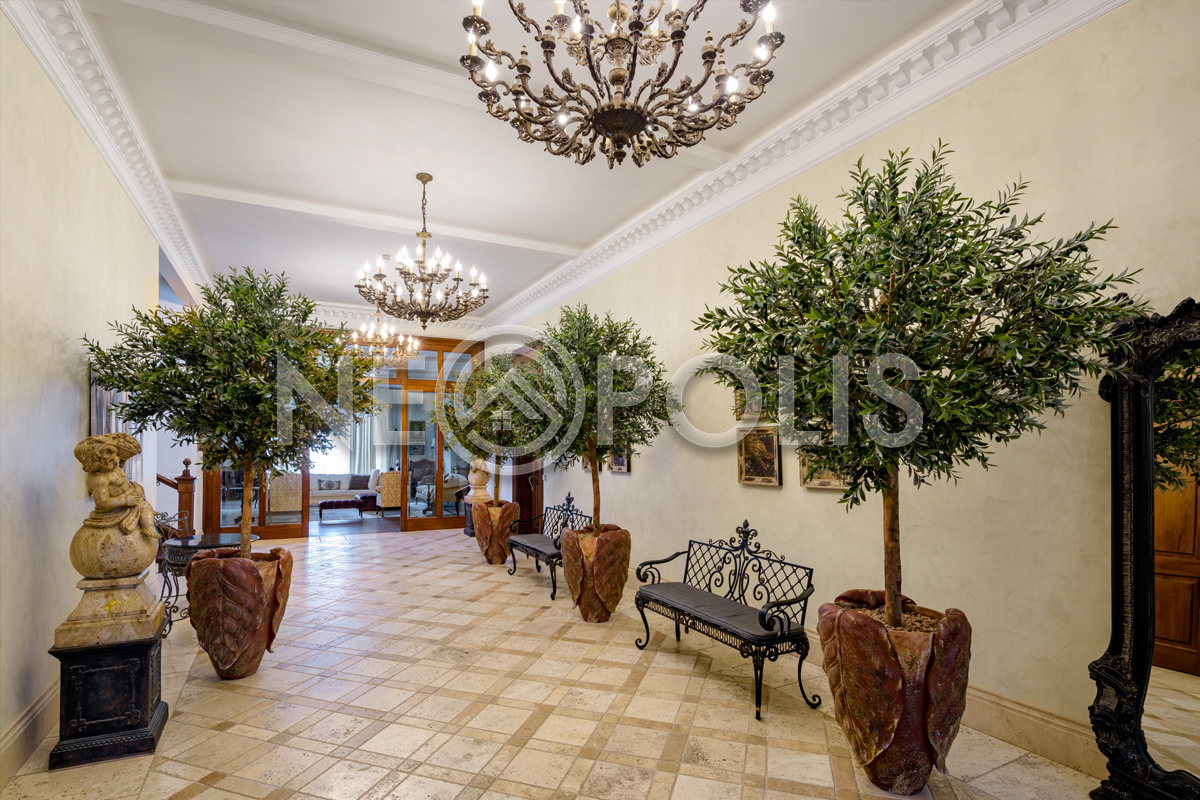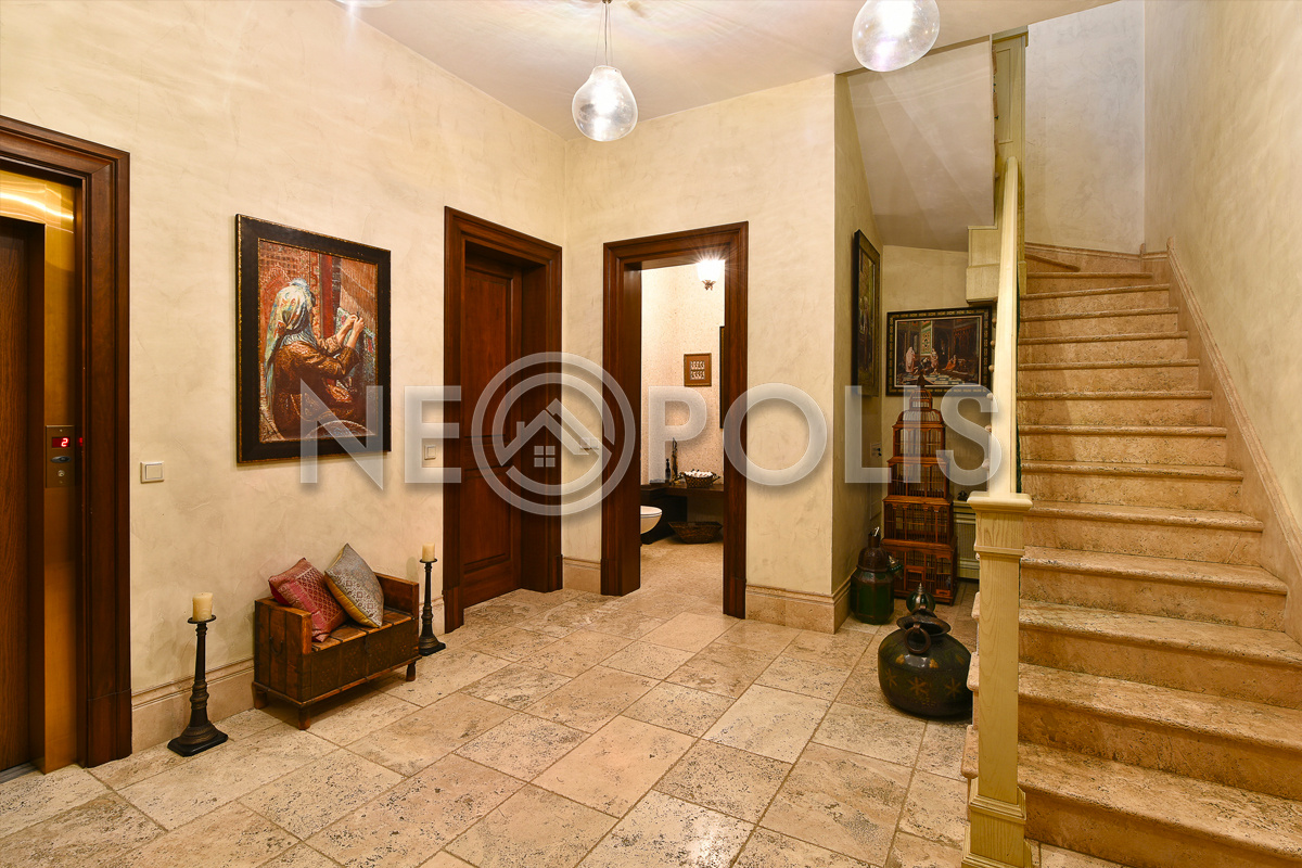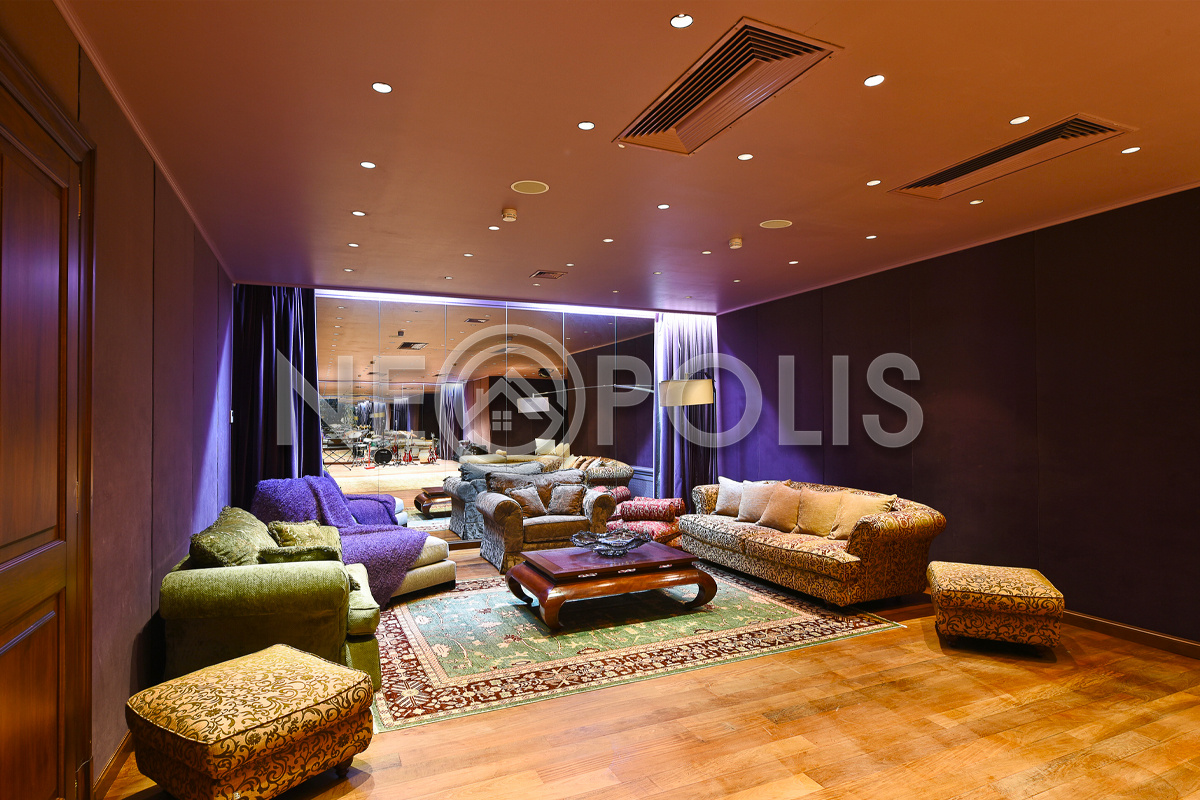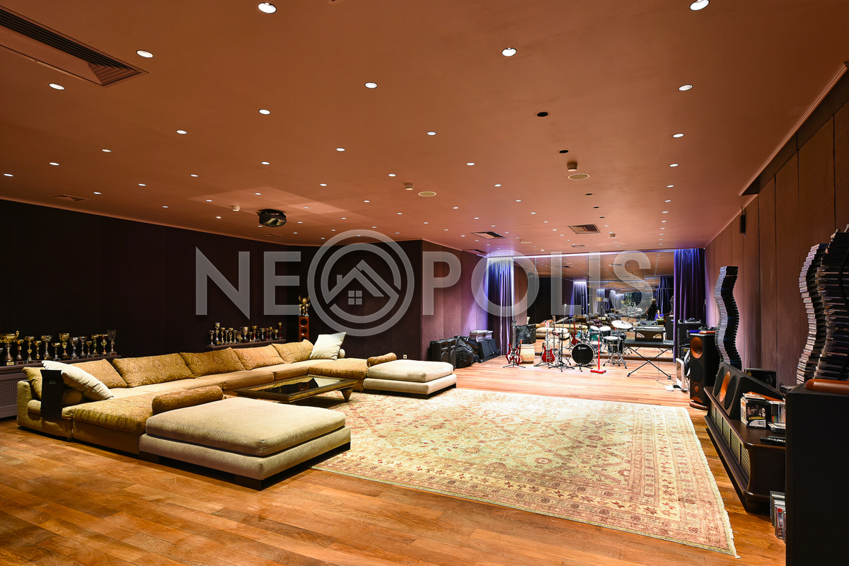 - Цоколь:холл, квартира для персонала (кухня, две спальни, ванная комната), киногостиная с танцевальной зоной и репетиционной базой, винный погреб с дегустационной, сезонная гардеробная, кладовые, технические помещения, лифт, санузел.