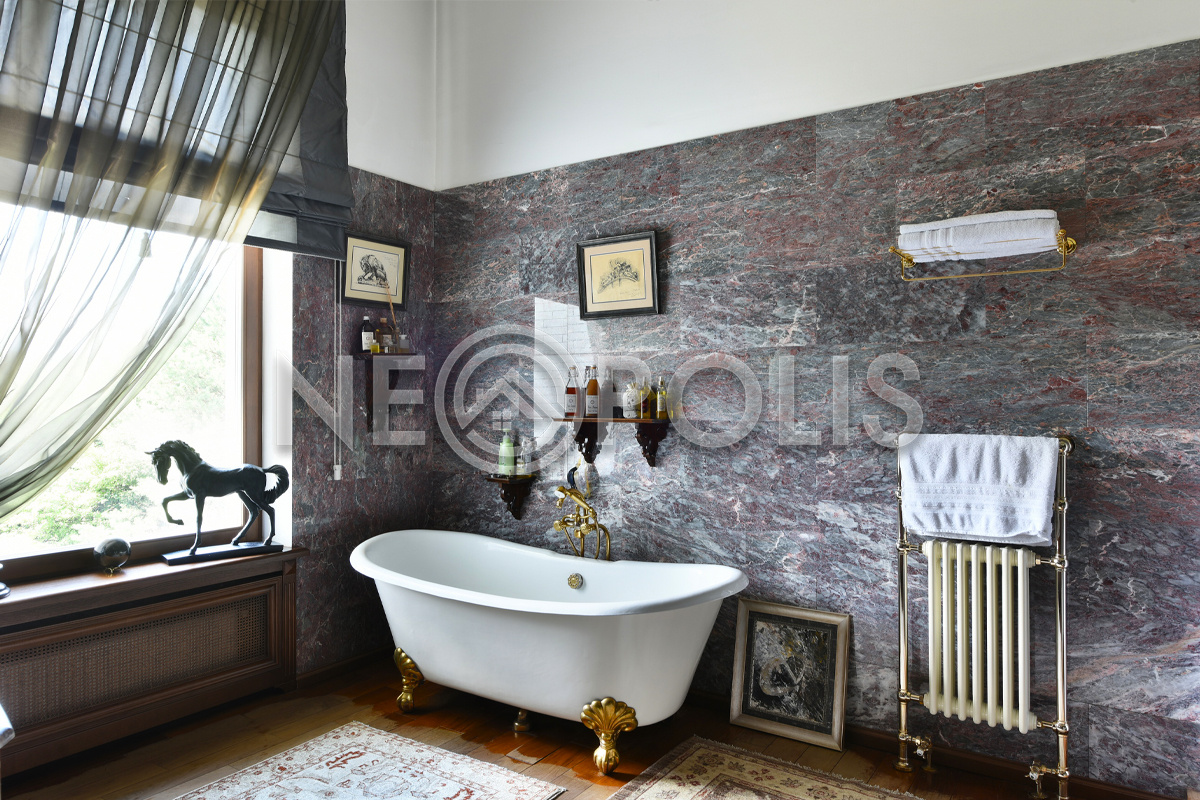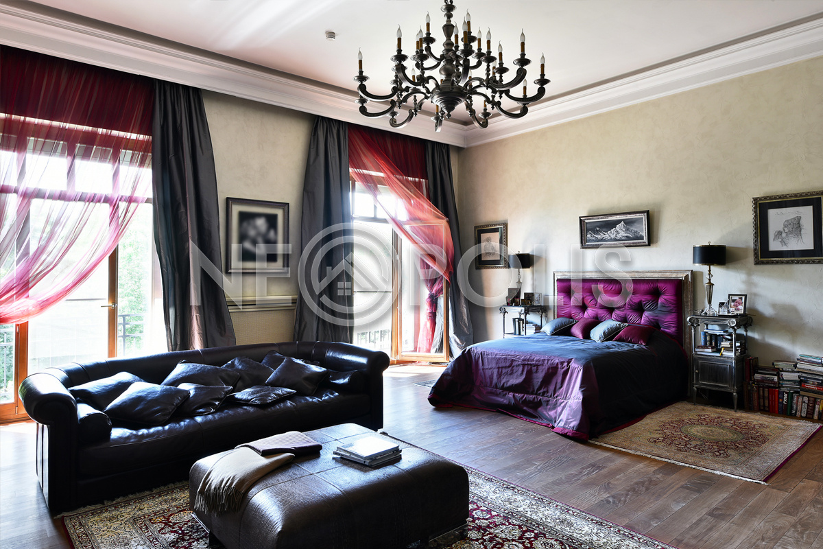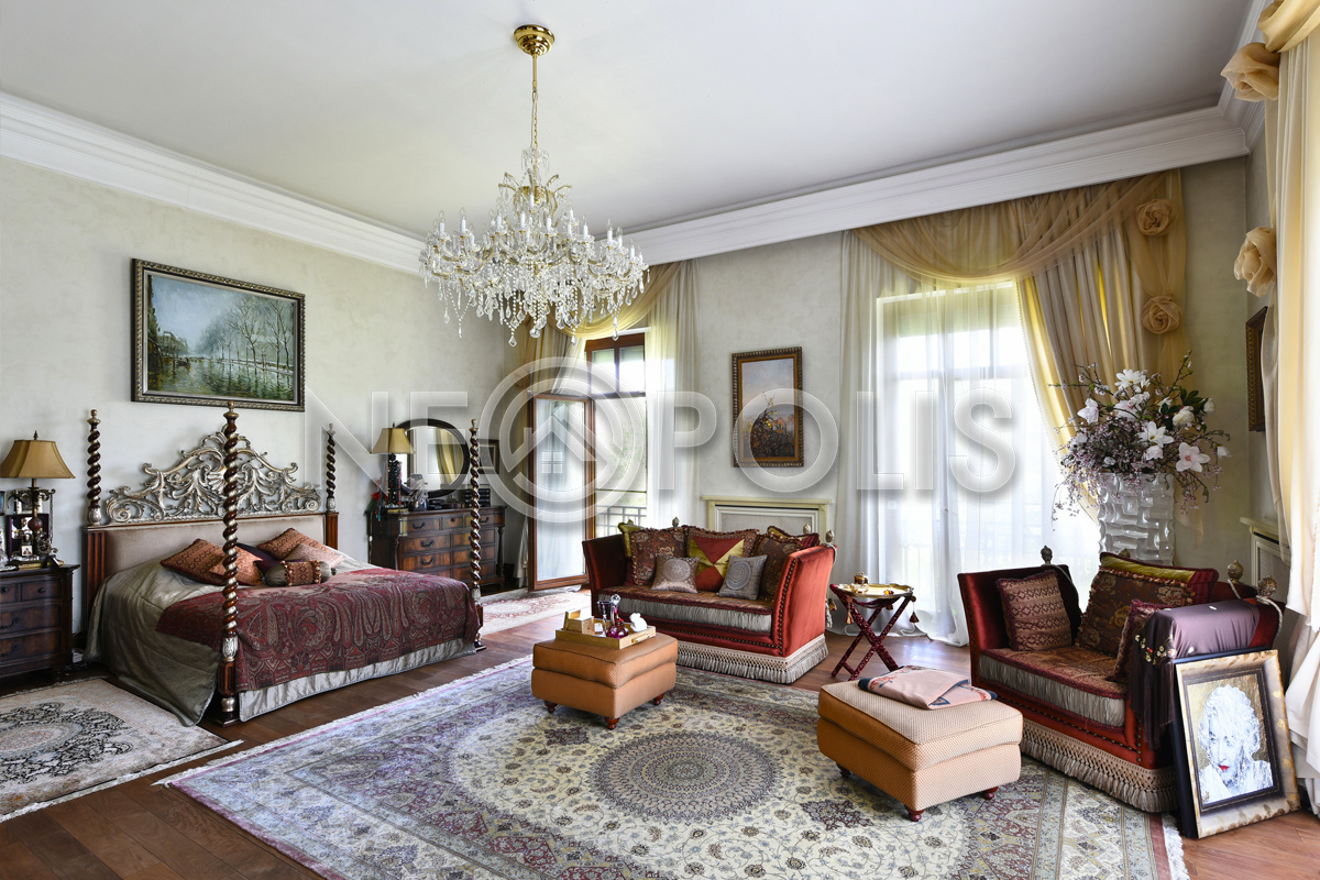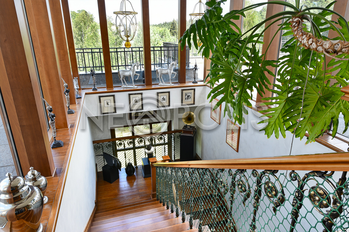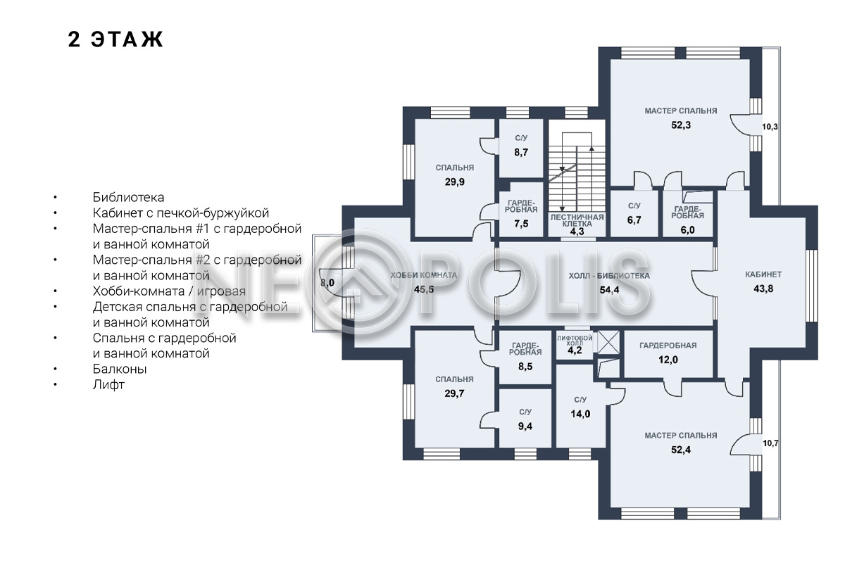 - 2 этаж:холл-библиотека, мастер-блок с двумя спальнями, двумя гардеробными и двумя ванными комнатами, кабинет; две спальни с гардеробными и ванными комнатами, хобби-комната.