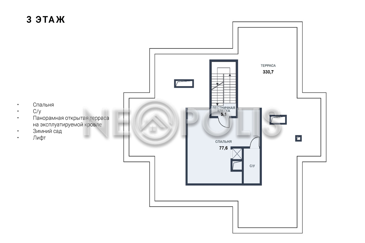 - Мансарда:спальня с ванной комнатой, зимний сад, открытая терраса на эксплуатируемой кровле.