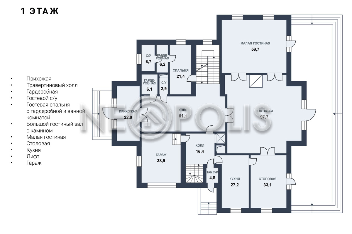 - 1 этаж:крыльцо, прихожая, холл с гардеробной, кухня, столовая, гостиная с камином, малая гостиная, спальня с ванной комнатой и гардеробной, санузел, гараж 38,9 кв.м.