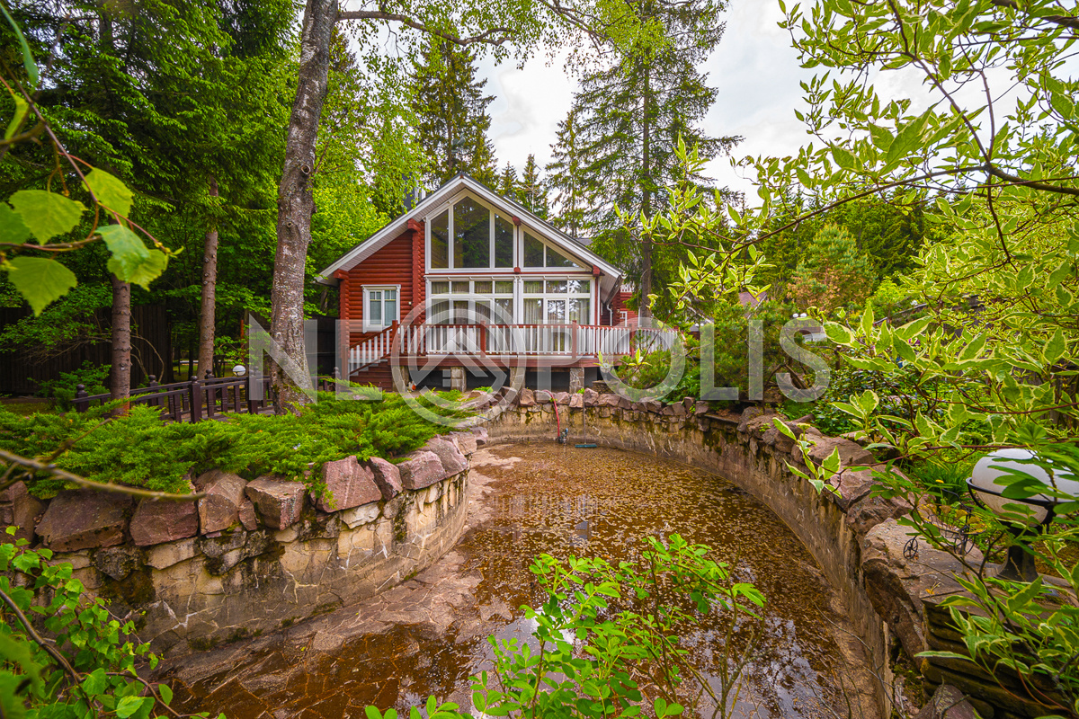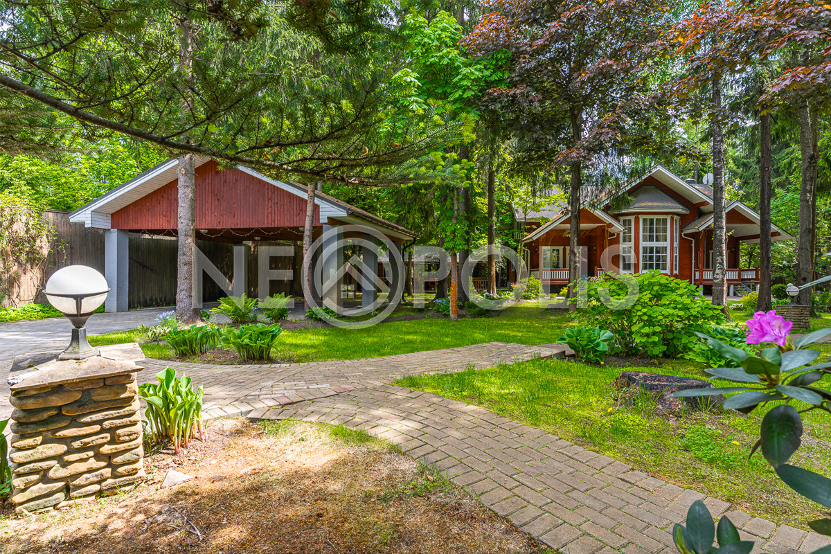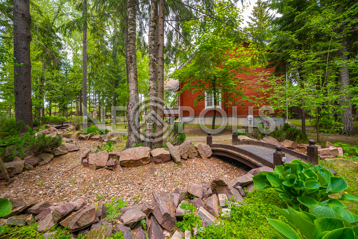 Участок занимает территорию почти пол гектара лесного массива (44 сотки), с профессиональным ландшафтом, пересекаемым сухим ручьем, через который перекинулись несколько мостиков на ту часть участка, где построен гостевой комплекс с баней площадью 309 кв.м..