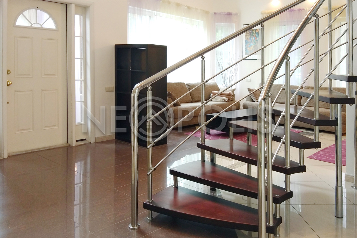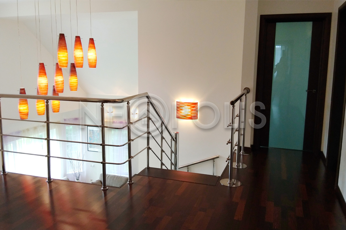 - Лестница: парящая, перила и опоры - хромированное железо, ступени - массив дерево