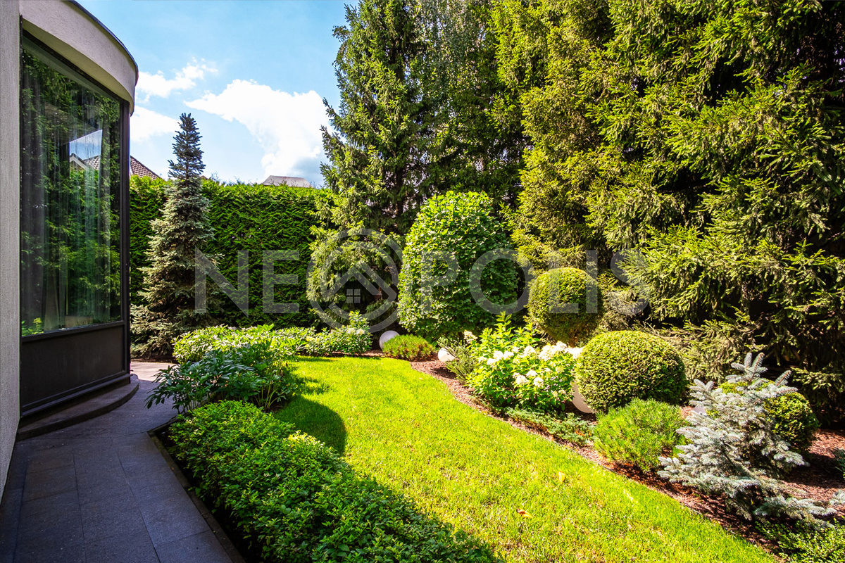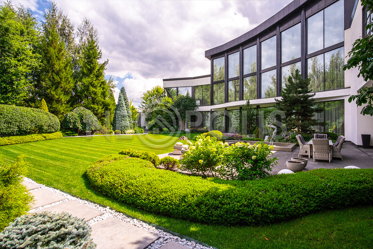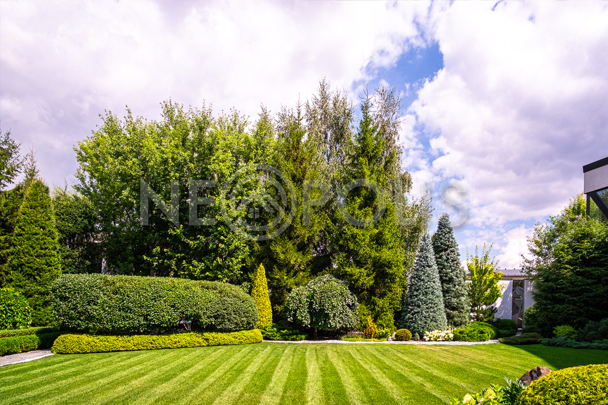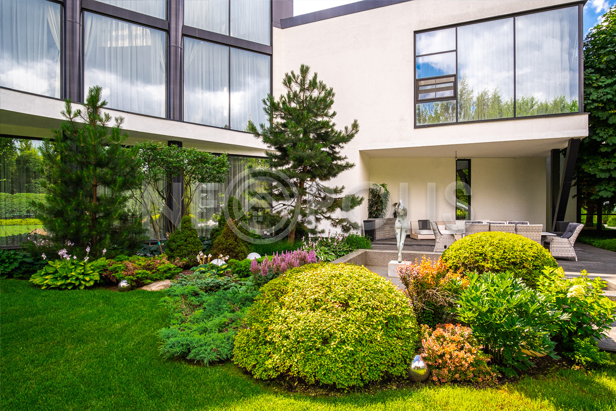 Профессиональный ландшафтный дизайн, большой зелёный многолетний сад с крупномерами и фонтанами, тихая приватная территория