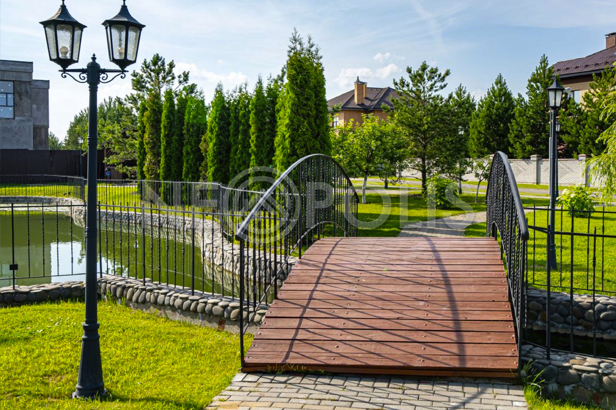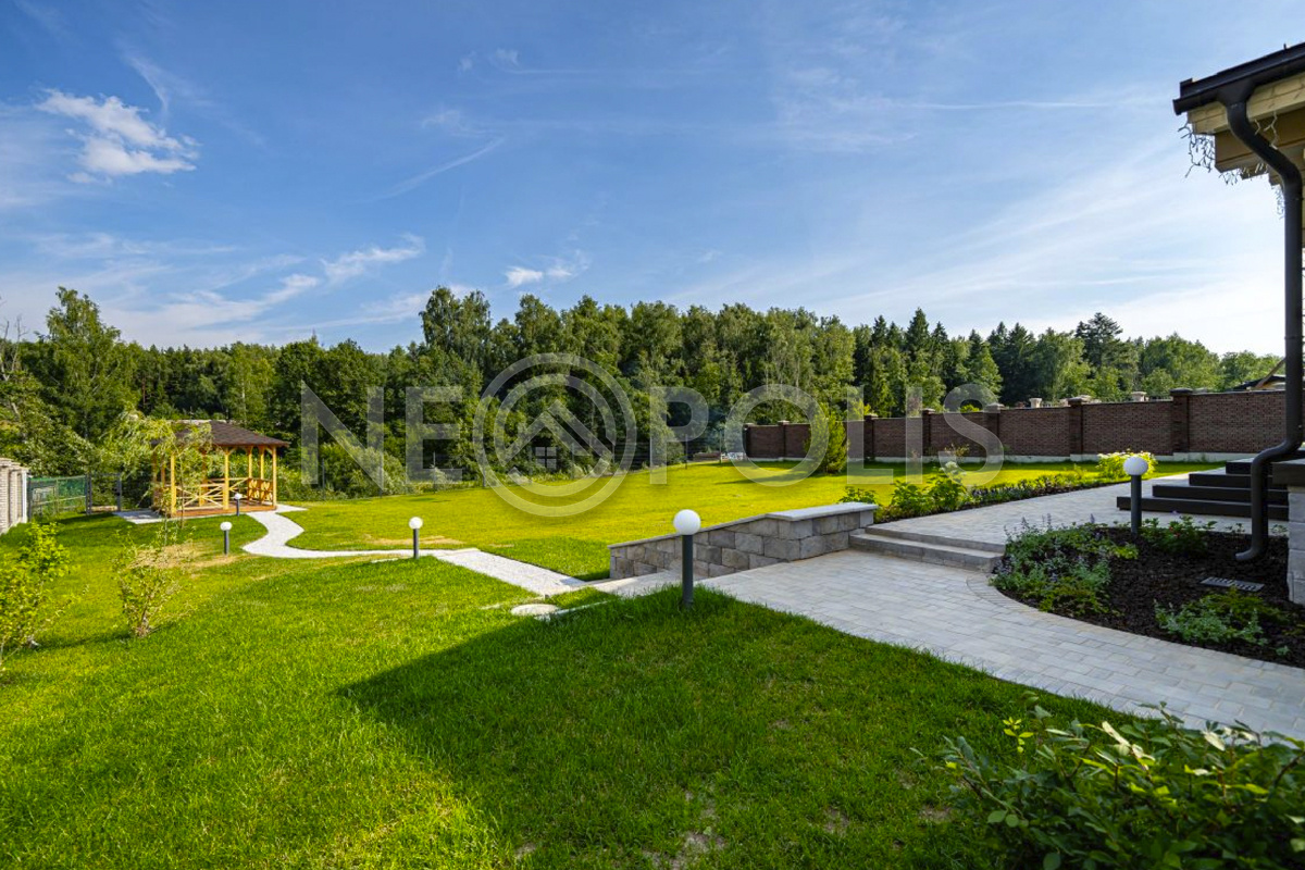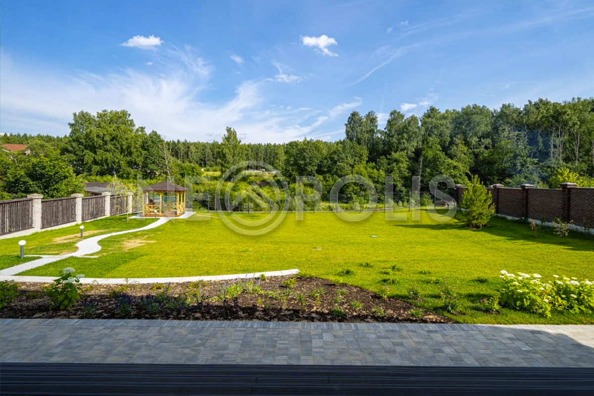 На участке растут хвойные и плодовые деревья, разбиты цветники, дорожки вымощены брусчаткой.