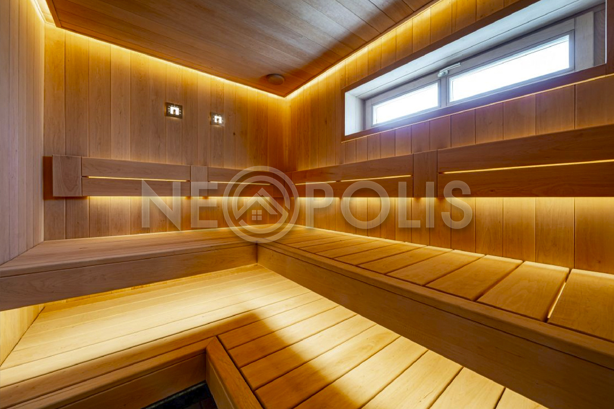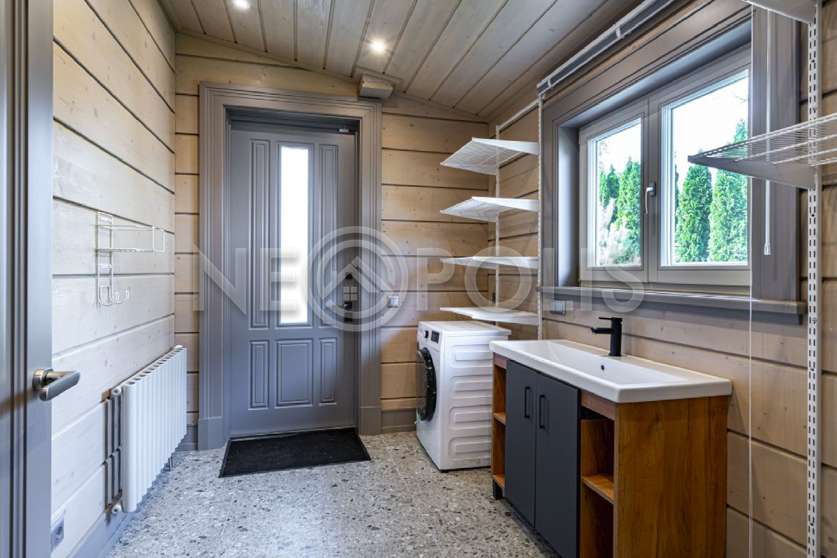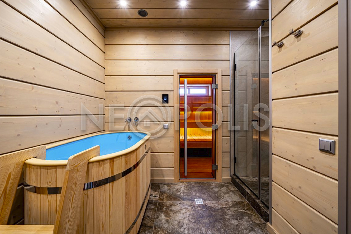 - 1 этаж:входная-холл, кухня со вторым светом (высота потолков до 6м) и выходом на террасу к уличному камину и в сад, столовая, большая гостиная, кабинет/гостевая спальня, SPA зона: русская баня с купелью, комнатой отдыха и санузлом с душевой; кладовая, постирочная и кладовая с отдельными входами с улицы.