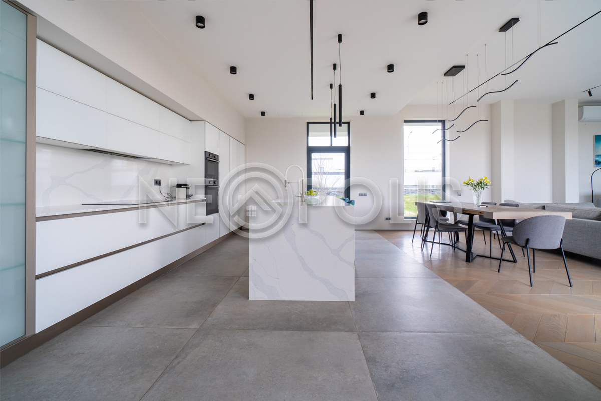 - Полы: инженерная дубовая доска LuxuryTree, Дуб Кавказский, Селект-Прайм, покрытая матовым лаком Silver Grey, на кухне и в санузлах – крупноформатный ректифицированный керамогранит PORCELANOSA (Испания) и керамогранит ITALON (Италия)