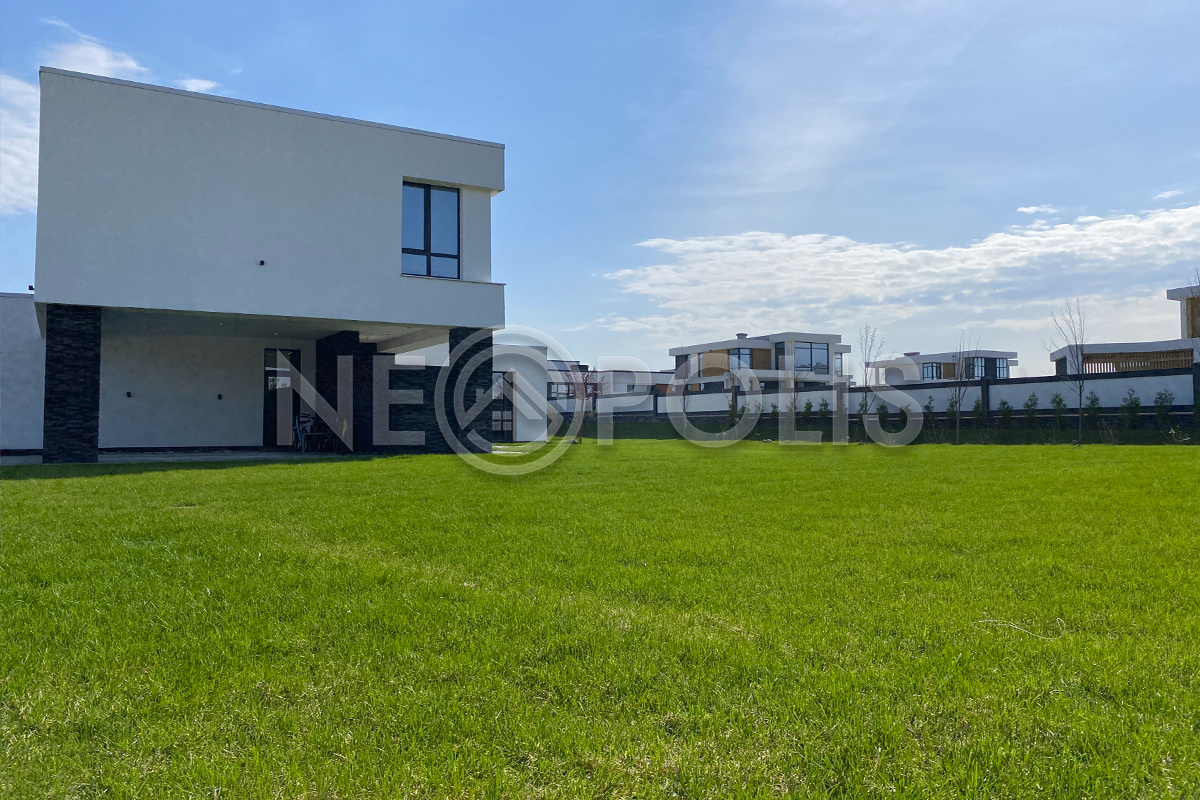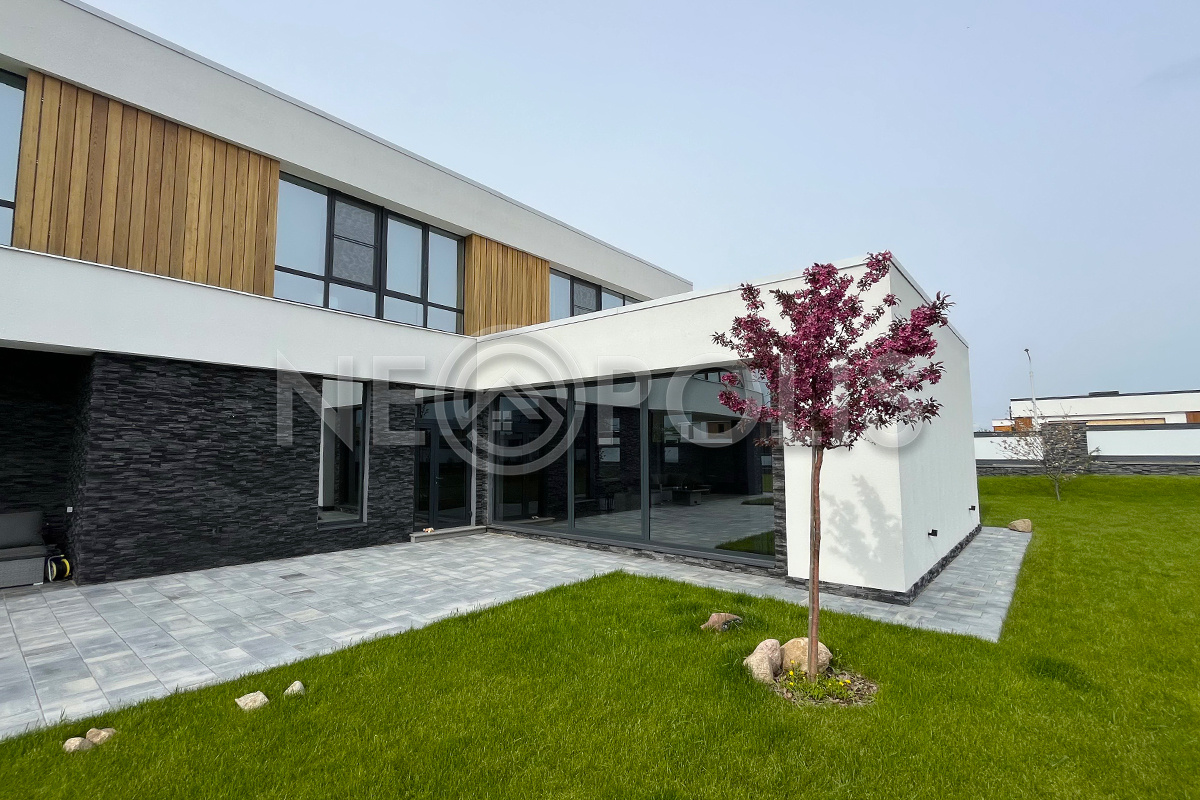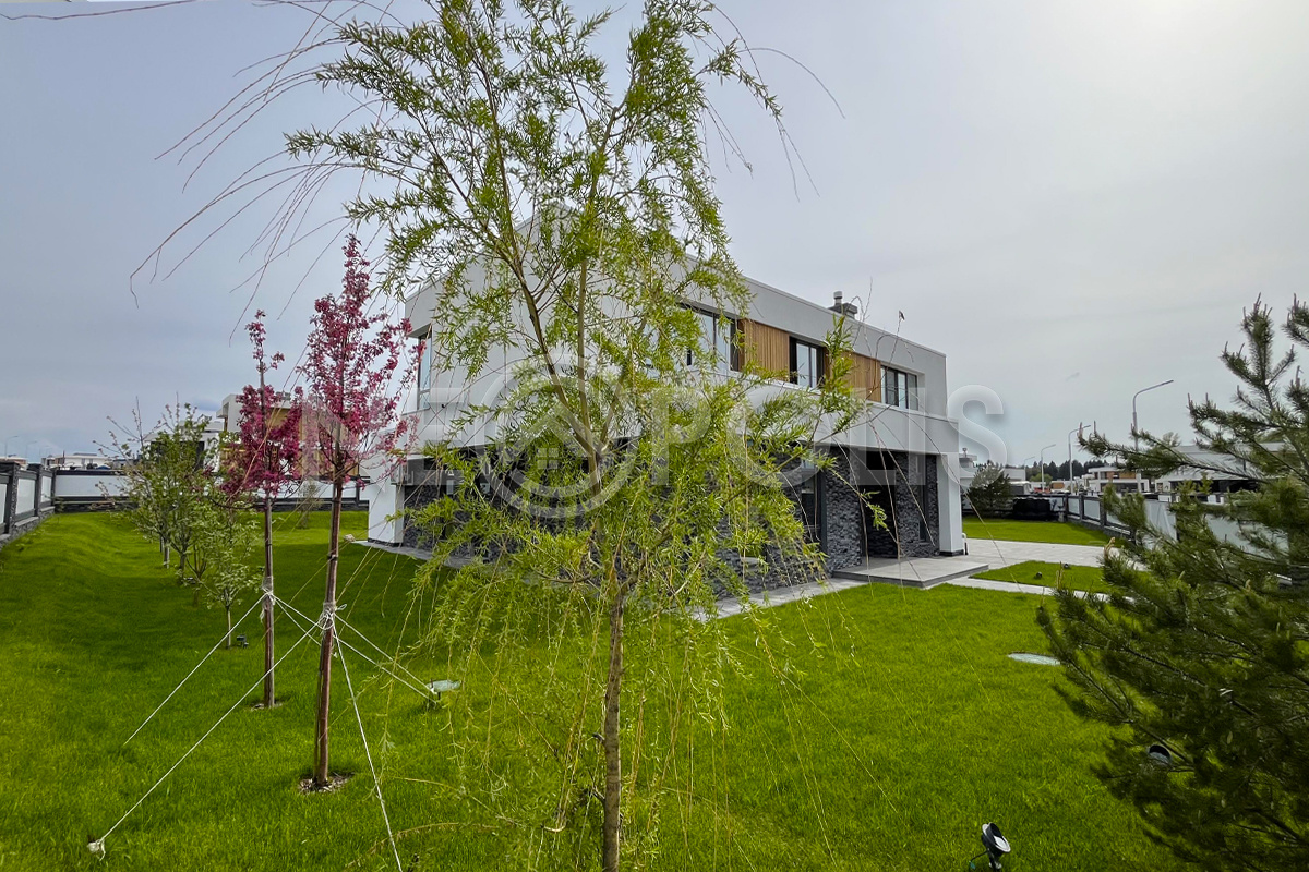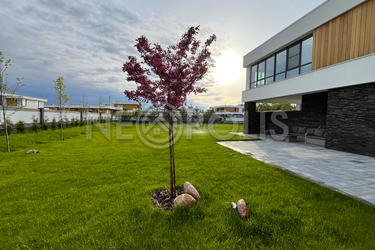 Выполнен проект ландшафтного дизайна: высажен газон категории "Elit" из 100% мятлика (GreenRoll, Россия), плодовый сад (2 яблони, 2 черешни, 2 вишни, 1 слива, 2 ирги Ламарка), декоративные деревья (8 сосен, 11 лип, 1 клён Гинала, 1 ива плакучая, 3 декоративных яблони, 2 рябины, 2 сирени), кустарники (30 туй брабанд), 16 кустов гортензий, уложена плитка Koldiz (Россия) «Новый город» (оникс чёрный), 60 мм, комплект из 3 видов, выполнена система Led-подстветки сада Hygge (Россия).