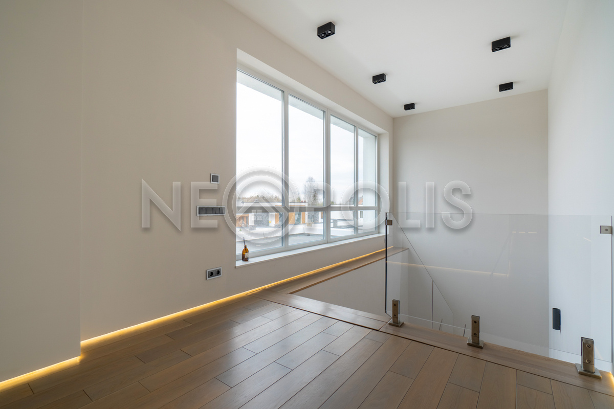 - Лестница: монолитная, ступени из инженерной доски со шпоном дуба, ограждение из закаленного осветленного стекла (Crystalvision - Япония)