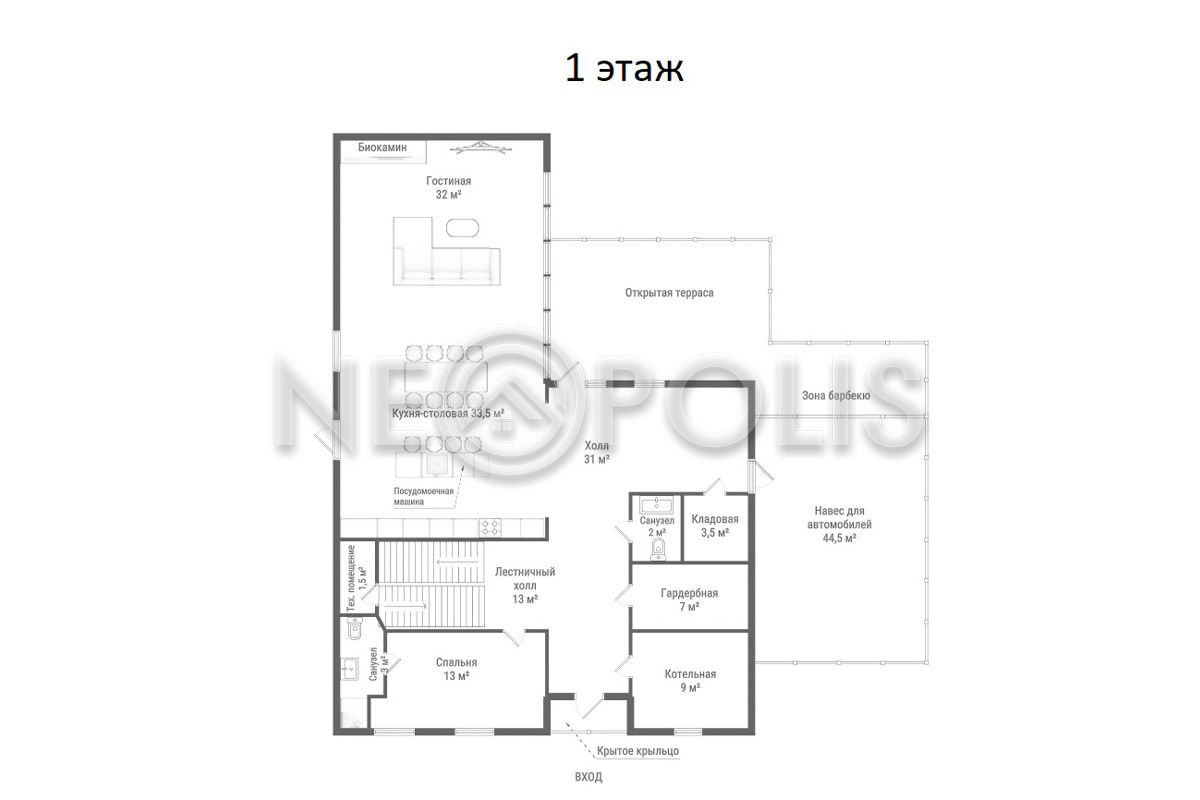 - 1 этаж:крытое крыльцо, лестничный холл, кухня-столовая с выходом на террасу, гостиная с биокамином и выходом на террасу к зоне барбекю, спальня с ванной комнатой, гардеробная, кладовая, санузел, техническое помещение, котельная.