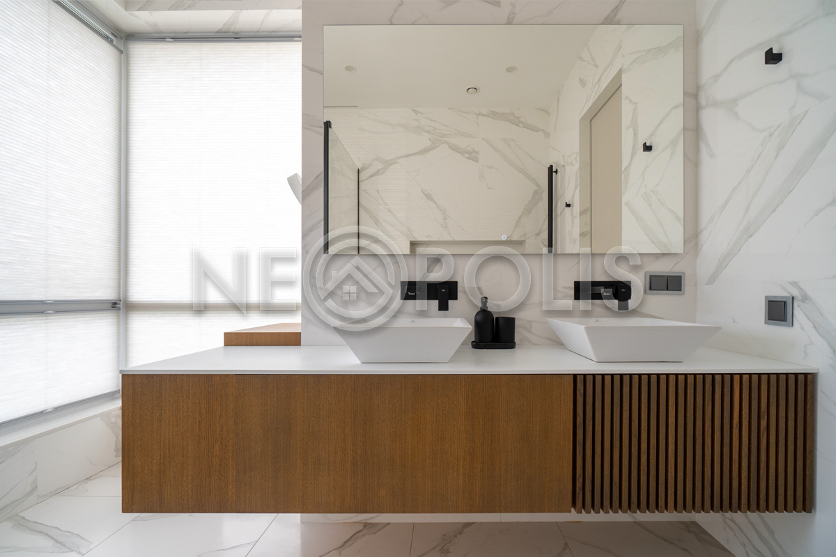 - Сантехника: смесители HANSGROHE (Германия), раковины NOKEN PORCELANOSA (Испания), душевая система TIMO Selen (Финляндия), ванна VILLEROY&BOCH (Германия)