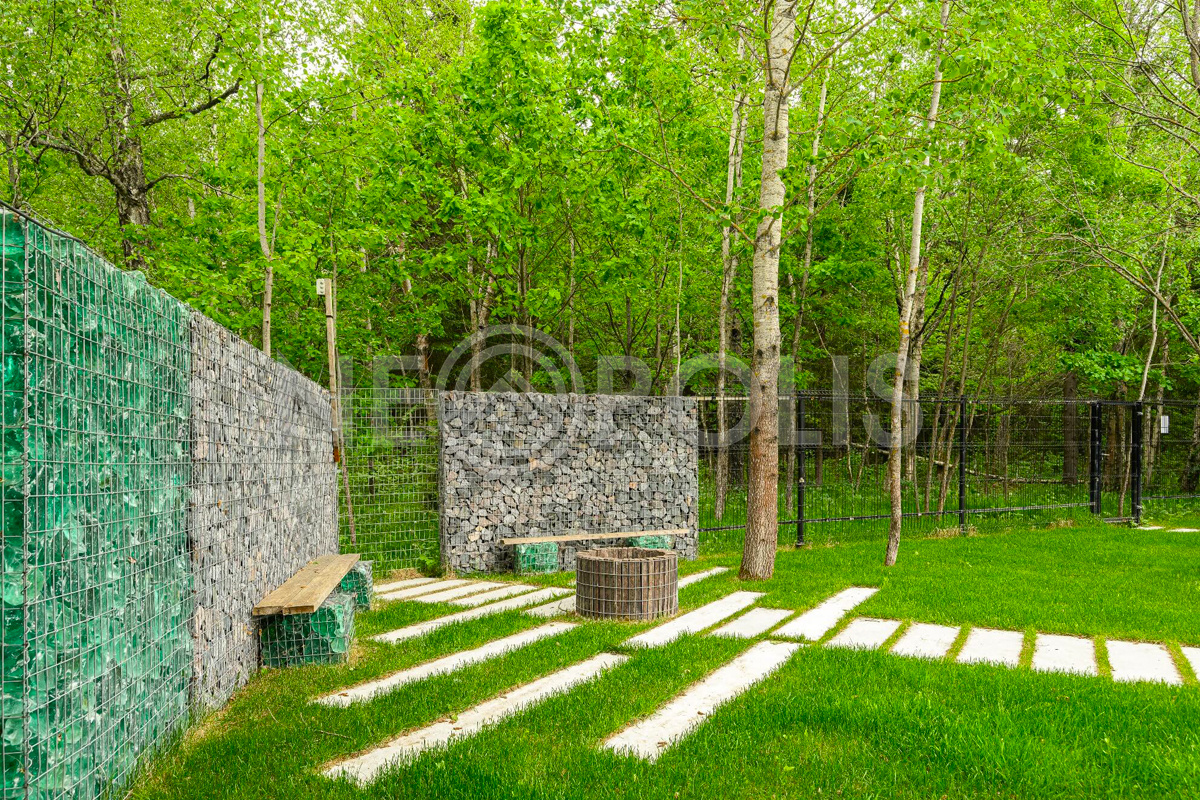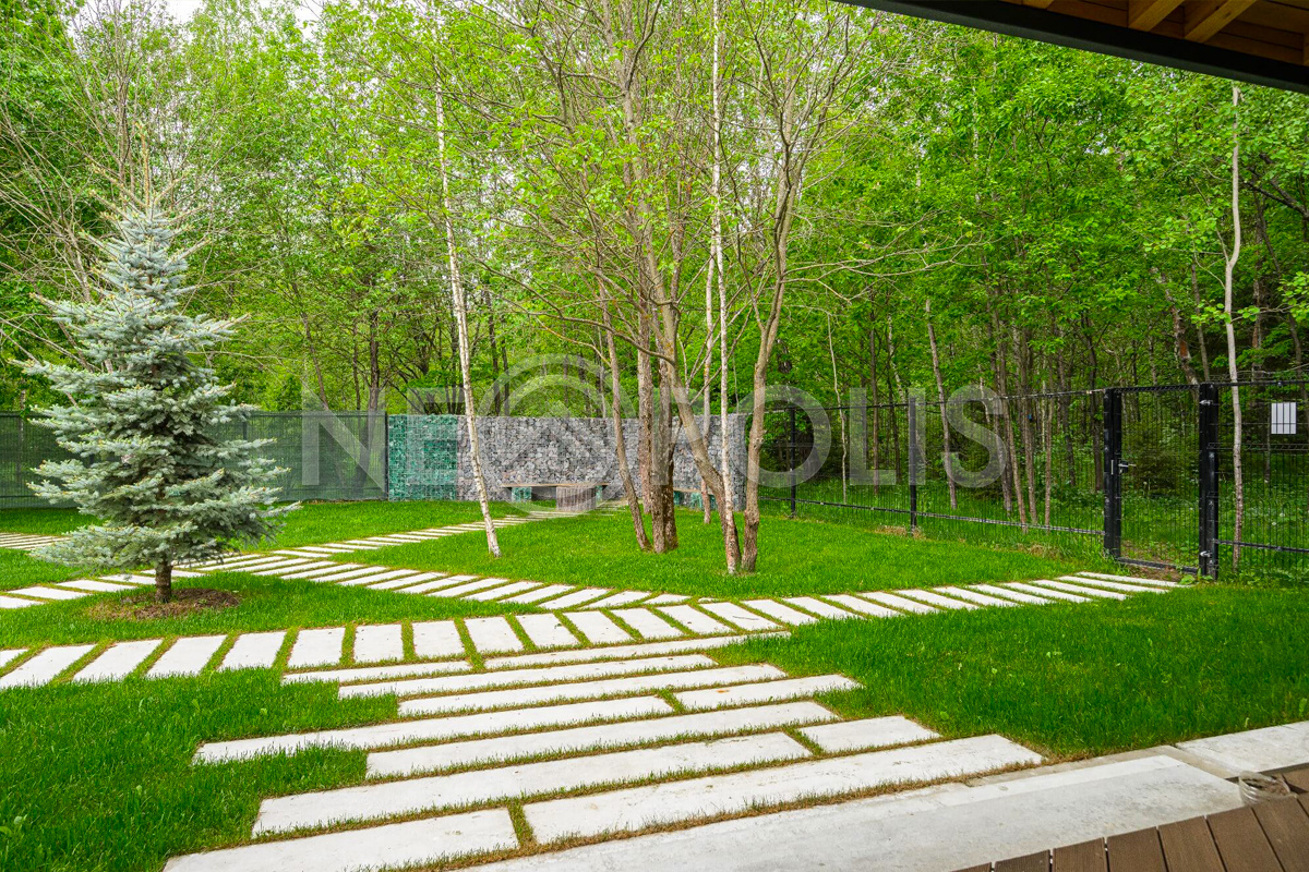 На участке - идеальный английский газон и пошаговые дорожки.