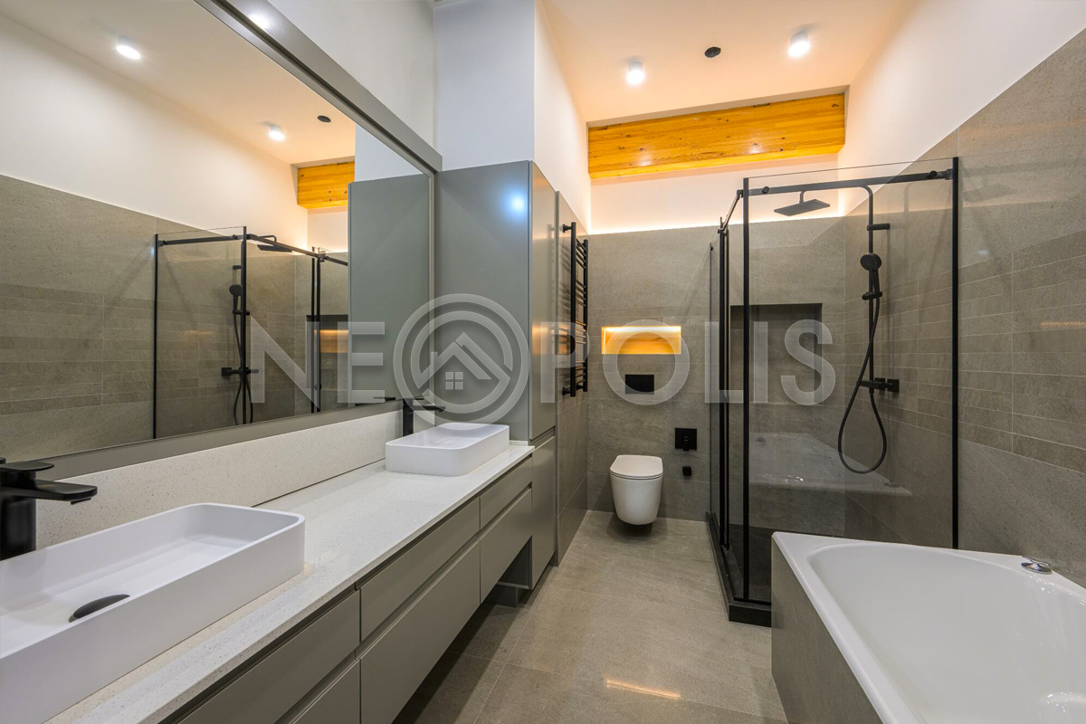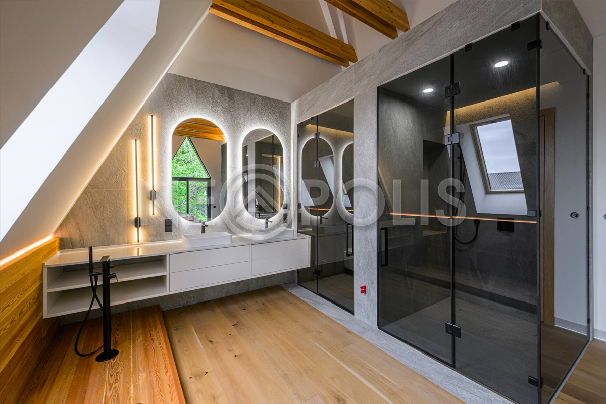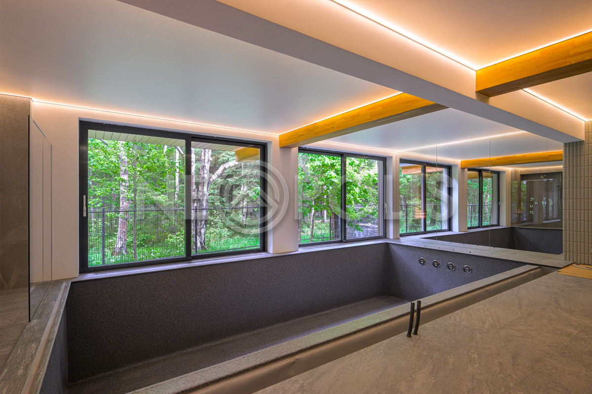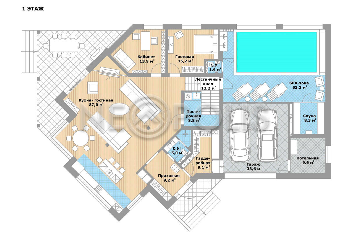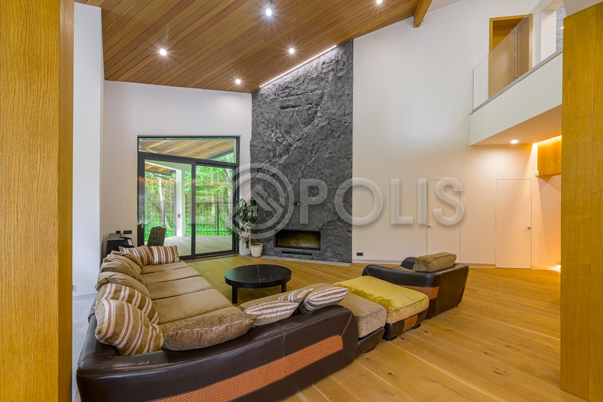 - 1 этаж:прихожая с гардеробной, кухня-столовая, гостиная с камином и выходом террасу, спальня с ванной, кабинет, санузел, постирочная; SPA зона: бассейн 53.3 кв.м., сауна; котельная, гараж на 2 авто 33.6 кв.м.